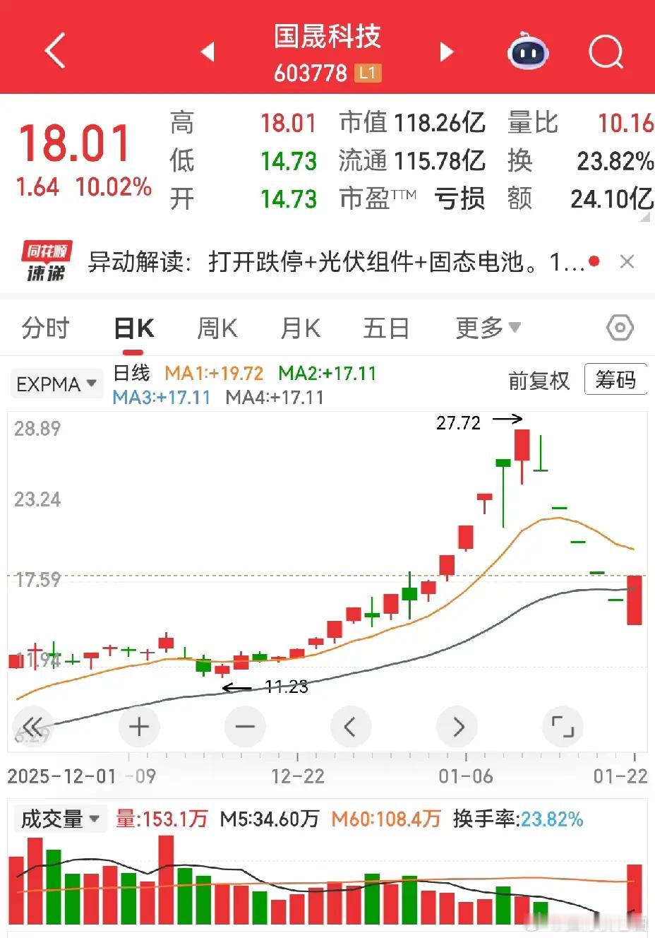 昨天有人问我利欧今天能不能进?这种问题无法回答,就利欧目前这种状况,两个一字跌停,会否第三次继续一字跌停,还不能确定,可以参照前两天高标的走势。前面高标跌比较多的是国晟,连续五个跌停以后,昨天来了一个地天板,昨天整个市场是高标反弹的一天,在此气氛烘托下,再加上跌幅过大,下午从地板拉起来,属于跟风走势,这地天板的成色几何,还得观察,不知道是不是主力自救行为。利欧,会怎么走我不知道,此处还没看到企稳迹象。至于介入时机,每个人把握点不一样,我一般不在下跌的时候买。有的高手喜欢买阴线,买阴线也是有一定技巧的,主要避免买在下跌中继。就拿国晟来说,如果在第三个跌停时介入,那么现在是第五个跌停板后的地天板,看上去收获了一个涨停,实际上股价比第三个跌停板还差一个多板的距离,这样的买阴线就不是技巧了,纯属是想碰运气。特别提醒:贴图欣赏,并非推荐,据此操作,风险自担。✦✦✦本人仅此一号,无微信群,不主动加人,主动加人者是骗子。请提高警惕,否则损失自负。✦✦✦