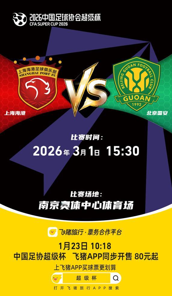南京奥体的呐喊声已预定!海港带着中超三连冠气势,国安揣着足协杯荣耀,这场“天王山之战”火药味拉满~ 我押海港,奥斯卡和武磊的配合绝了!你的选择是?飞猪邀苏超球迷为超级杯加油