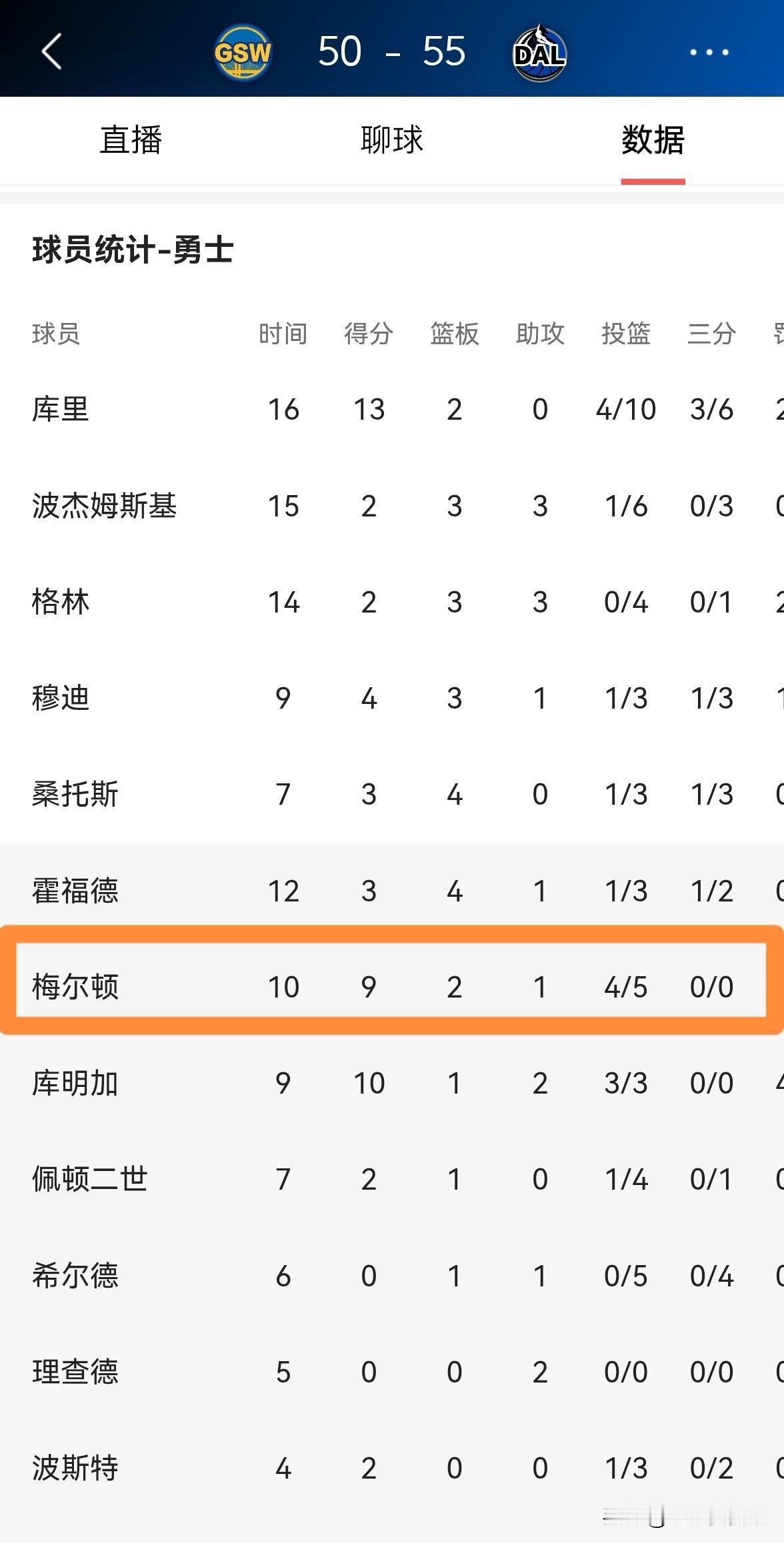 我真是特别喜欢勇士大将梅尔顿!在今天进行的勇士和独行侠的比赛中,目前双方半场战罢,勇士暂时以50:55落后于对手。在前两节比赛中,梅尔顿替补出战10分钟,投篮5中4,其中罚球2中1轻松砍下9分2篮板1助攻1盖帽,他的场上正负值为+17。 试问像梅尔顿这种既攻防兼备又便宜的球员,谁不喜欢呢?勇士真是捡到了一个大便宜!