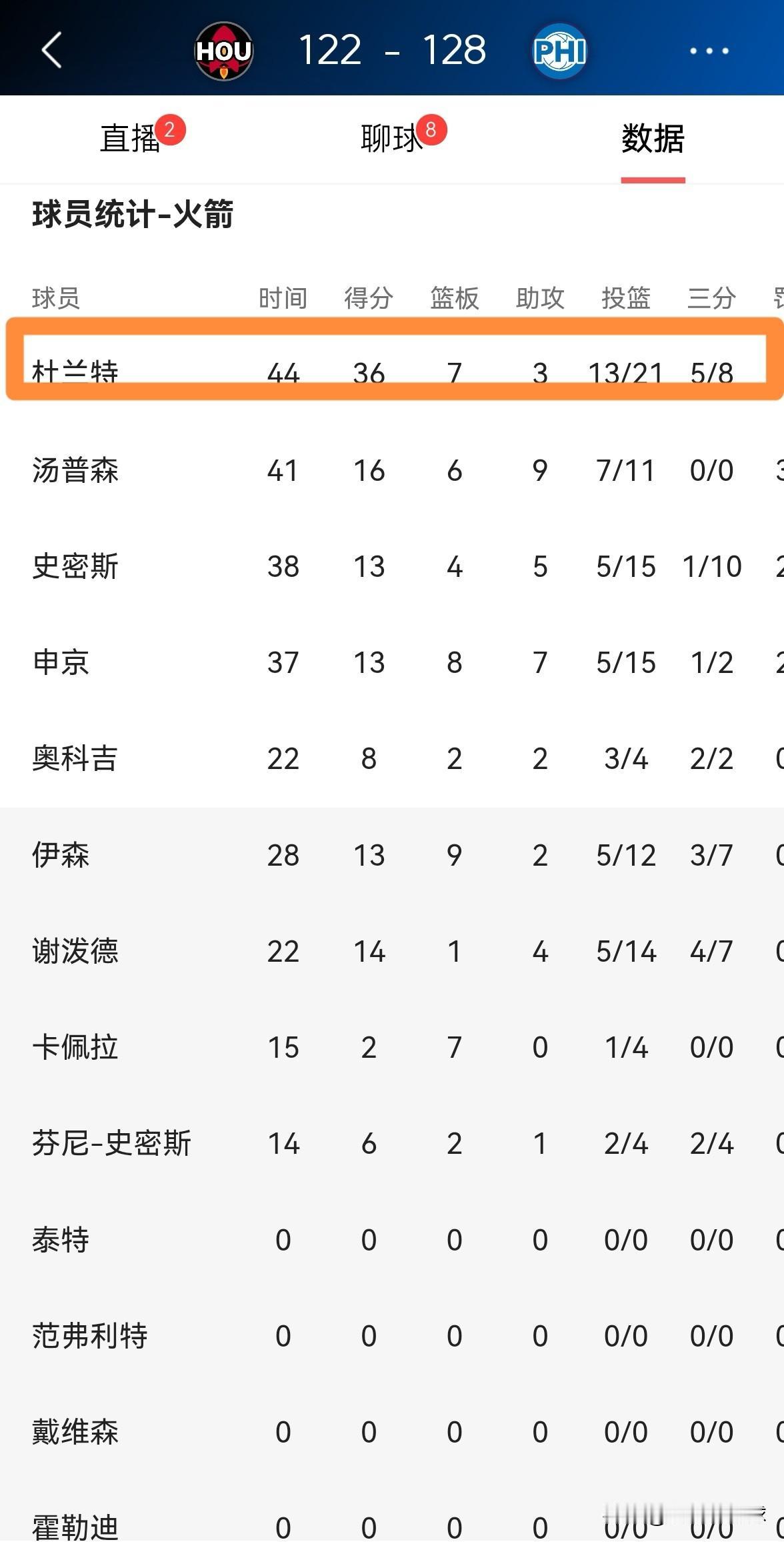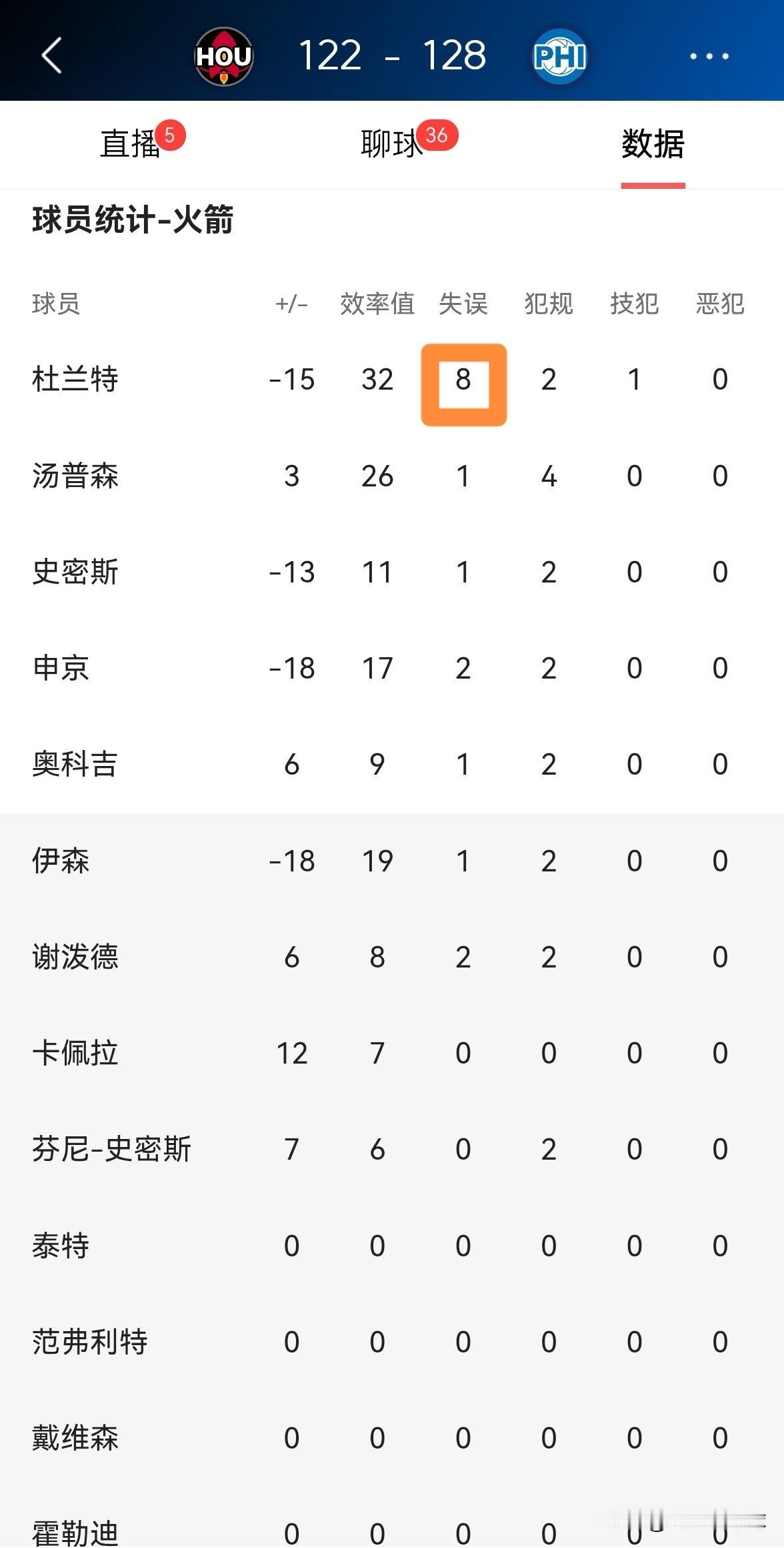 火箭超级巨星杜兰特必须要背锅了!在今天火箭客场以122:128不敌76人的比赛中,虽然杜兰特在首发出战的44分钟里,投篮21中13,其中三分球8中5、罚球6中5爆砍36分7篮板3助攻1盖帽,但是他却出现了不可思议的8次失误,他的场上正负值为-15。 作为球队的绝对核心和当家球星,即便杜兰特得到了全队最高的36分,但是他的8次失误严重的伤害到了球队,杜兰特必须要为球队的失利负责。