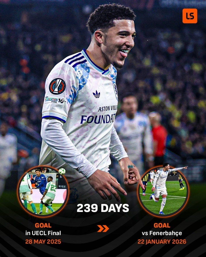 #桑乔打破8个月球荒#欧联杯第7轮,维拉客场1-0击败费内巴切,曼联租将桑乔攻入维拉生涯处子球,这也打破了个人的长期球荒。据统计,桑乔上一次进球还是在2025年5月28日的欧协联杯决赛,他的进球帮助切尔西4-1击败贝蒂斯,夺冠捧杯。桑乔打破了长达8个月的球荒,两粒进球相隔239天。