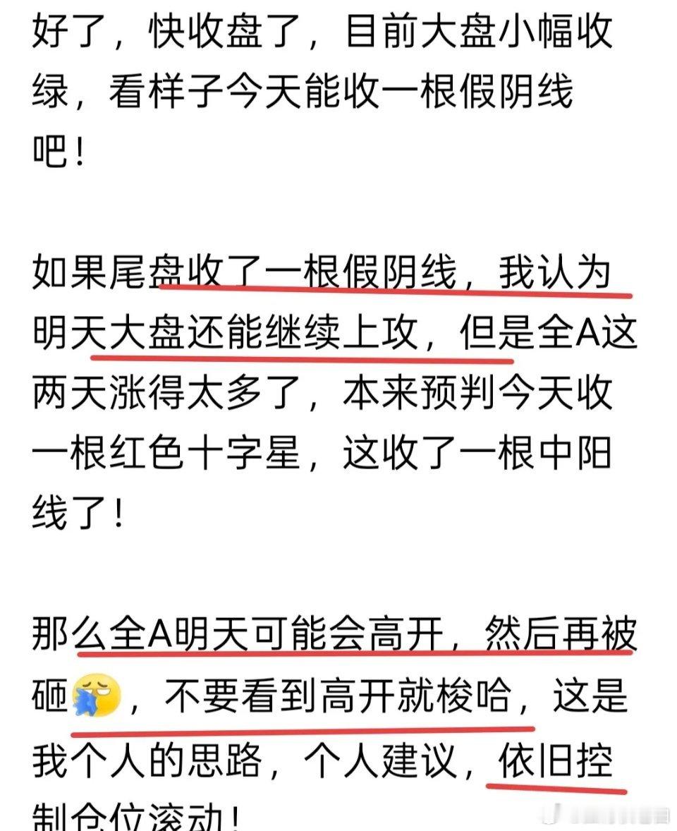 今天思路很明确,全A高开走强、表现亮眼,当下优先处理手中持仓,暂不开新仓。盲目开新很容易买在半山腰,性价比太低。今天会不会回落承压不好判断,唯一要做的就是多滚动操作,有盈利就及时做T,积少成多最稳妥。不清楚今天护盘资金会不会再次出手干预,从日线形态看,大盘自然走势大概率会走双头结构,接下来还有1-2天的上涨窗口期。