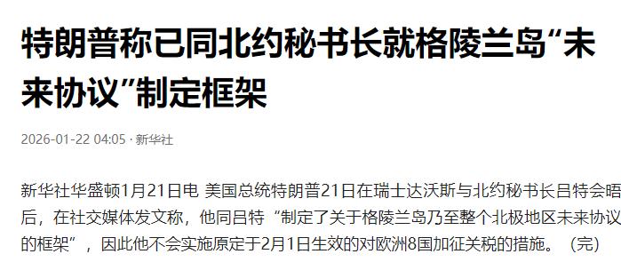 特朗普再度变脸,欧盟可以继续反华了。 当地时间1月21日,特朗普在与北约秘书长吕特会晤后发文称,他与吕特“制定了关于格陵兰岛乃至整个北极地区未来协议的框架”,因此他不会继续实施因八国联军援丹决定原定于2月1日生效的加征关税措施。 特朗普在达沃斯突然撤回对欧洲八国的关税大棒,表面看是为了格陵兰岛的“无限期协议框架”,实则是一场里外都不讨好的政治算计。这个所谓的框架协议,说白了就是美国想用“军事进入权”和矿产开发权换欧洲闭嘴,嘴上说不要主权,身体却很诚实地要在北极部署“金穹”导弹系统,顺带把格陵兰的稀土矿攥手里。 可欧洲人也不傻,去年特朗普刚威胁对欧盟加征50%关税,转头又说“我们爱着对方”,这种翻脸比翻书快的操作,让德国外长马斯直接在日本喊话“不能让特朗普分裂欧洲”。现在八个被威胁的国家里,法国总统马克龙直接缺席达沃斯,欧盟主席冯德莱恩赶在特朗普来之前跑路,摆明了不信任这位商人总统的口头承诺。 这事放到台海棋盘上看,特别有意思。特朗普玩的还是那套“关税威胁+利益交换”的老把戏,当年说“敢动台湾就加征200%关税”,现在又用格陵兰关税逼欧洲站队。可问题是,美国自己的关税牌早就烂在手里了。 就说台海吧,特朗普政府一边让台湾掏5000亿美元“保护费”转移半导体产能,一边在俄乌冲突里消耗军火库存,现在连中东都腾不出手,哪来的余力真为台湾打仗?看看格陵兰的例子就知道,当欧洲集体强硬时,特朗普立马退缩,这种“纸老虎”本质,台湾岛内其实早有察觉。 台积电在美国建厂成本翻倍、利润腰斩,民进党当局还在吹“美台协议”,结果岛内算总账:5000亿美元够盖275栋101大楼,够发67次全民红包,现在全成了给美国的投名状。 更关键的是,美国在盟友眼里已经成了“不靠谱”的代名词。去年特朗普刚和欧盟说要联手对付中国,转头就因为钢铝关税翻脸;现在为了北极利益,又把欧洲从“敌人”拉回“伙伴”。这种无底线的实用主义,让欧盟明白:跟着美国反华捞不到好处,反而会丢了中国市场。 就像中欧峰会后,欧盟明确表示“对华政策不变”,因为他们知道,中国是欧盟最大的贸易顺差来源国,真和美国绑死了,德国汽车、法国红酒往哪儿卖?这种务实态度,和台湾民进党当局的“抗中保台”形成鲜明对比,人家欧盟至少知道什么是利益,台湾却在拿整个岛的未来赌美国的承诺。 回到格陵兰协议本身,最讽刺的是岛上85%的居民根本不买账,丹麦更是咬死主权不放。这和台海何其相似?美国嘴上说“保护台湾”,实际是要把台湾变成“不沉的航空母舰”,真到关键时刻,看看乌克兰就知道,美国只会送“过期军火”和“空头支票”。 现在特朗普为了北极战略暂时安抚欧洲,转身又在台海玩“以台制华”,这种双线操作的结果,只会让更多台湾民众看清:美国在乎的从来不是台湾,而是自己的霸权棋子。当欧洲都开始对美国关税威胁免疫时,台湾还有什么理由相信“抗中靠美”的神话? 说到底,特朗普的变脸戏码,暴露的是美国霸权的底色,用恐吓和利益分化对手,却从不考虑盟友的死活。这种模式在格陵兰行不通,在台海更行不通。台湾产业被美国抽血、民众被政客欺骗的现实,已经证明“倚美谋独”是条死胡同。 而欧盟对美国的敷衍态度,更说明国际社会越来越不吃“选边站”那套。当特朗普在达沃斯宣布取消关税时,台海的明白人应该懂了:真正能保护台湾的,从来不是美国的关税大棒,而是14亿大陆同胞的血肉长城。