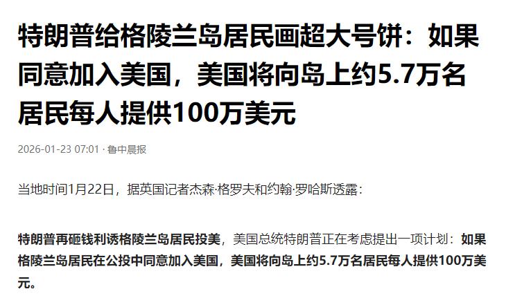 直接翻十倍!特朗普向格陵兰岛居民开出最新价码,每人100万美元。 特朗普这回是真把商人本色亮出来了,给格陵兰岛5.7万人每人发100万美元,总价570亿美金买“入美门票”。这事儿乍一听像暴发户买岛,细琢磨全是算计:5.7万人,每人100万,相当于给每个家庭发三四百万(岛上家庭平均3-4口人),搁谁都得掂量掂量。但问题是,这钱真能买到主权吗? 先说最直白的账,格陵兰去年人均GDP不到4万美元,100万美金相当于普通岛民25年的收入。特朗普算的是“买断未来”,你现在拿我100万,以后别找丹麦要每年6亿的补贴了。可岛民不傻:丹麦的钱是年年到账的“工资”,美国的100万是一次性“遣散费”。 好比你在国企拿稳定工资,突然有人甩你一笔钱让你辞职,看似豪爽,实则断了后路。更关键的是,格陵兰的福利体系全靠丹麦兜底,看病、教育、基建都是丹麦掏钱。真并入美国,这些福利立马缩水,美国连全民医保都没有,岛上60%的人靠政府救济,谁愿意拿100万换低保? 再说主权的死穴,格陵兰自治没错,但外交国防攥在丹麦手里,这是写进宪法的。就像香港有高度自治权,但国防外交归中央,道理一样。特朗普想绕过丹麦直接跟岛民交易,好比买二手房不找房东,只跟租客谈,租客签了字也过户不了。丹麦首相说得清楚:“格陵兰不是商品,主权问题没得谈。”去年格陵兰公投,85%的人反对入美,支持的连零头都不到,民意明摆着。 特朗普为啥这么执着?北极航道和稀土是关键。全球变暖让北冰洋航线开通在即,从亚洲到欧洲走北极能省15天航程,谁控制格陵兰,谁就捏住这条“黄金水道”。 岛上稀土储量占全球12%,镍、钴这些新能源关键矿产更是美国急需的,现在被中国、澳大利亚卡脖子,特朗普想在北极搞个“资源后院”。军事上更直白,美军在格陵兰的图勒基地能监控俄罗斯核潜艇,升级成“金穹”反导系统后,莫斯科的导弹发射全在美国眼皮底下。 但特朗普的商人思维害了他,他以为花钱就能搞定一切,却不懂主权不是菜市场买菜。丹麦虽说小,背后站着欧盟,法国德国直接放话,敢动格陵兰就激活“反胁迫条款”,冻结美欧贸易。欧洲国家联合军演,摆明了给丹麦撑腰。美国国会也不傻,570亿美金相当于每年国防预算的十分之一,共和党议员都反对:“为了个苦寒之地得罪盟友,疯了?” 岛内的情况更微妙,表面看,100万美金诱惑大,但格陵兰人骨子里的“北极认同”比钱重。他们自称“因纽特人”,跟丹麦的关系像远房亲戚,跟美国却是八竿子打不着。去年记者采访渔民,大叔直接说:“我们不想当美国人,不想孩子学英语,不想吃麦当劳。” 当地政党Demokraatit上台,纲领第一条就是“拒绝任何形式的主权交易”。特朗普团队倒是拉拢了一小撮亲美派,比如Naleraq党,但支持率连10%都不到,掀不起浪。 最讽刺的是,特朗普的“金元攻势”反而让格陵兰更团结。以前岛民抱怨丹麦补贴不够,现在美国一掺和,反而唤起了主权意识。首府努克的街头到处是“不卖岛”的标语,连年轻人都加入抗议——他们担心美国来了,传统捕猎权被限制,北极熊保护区变成矿区。去年有个段子:特朗普说“格陵兰是美国的北极明珠”,岛民回怼:“明珠长在丹麦的皇冠上,抠不下来。” 说到底,特朗普的100万美金是笔糊涂账。他算经济账,不算政治账;算眼前账,不算长远账。格陵兰人要的不是横财,是尊严和自治;丹麦守的不是领土,是主权红线;欧洲反的不是美国,是霸权逻辑。 这出“金钱买岛”的闹剧,最后大概率变成特朗普的政治秀——选举年放点狠话,转移国内通胀矛盾,至于能不能成,他自己都不信。毕竟,真金白银砸下去,连个水花也没溅起来,反而让全世界看明白:主权不是商品,民意不是数字,就算美国总统,也不能用钱买断一个民族的灵魂。