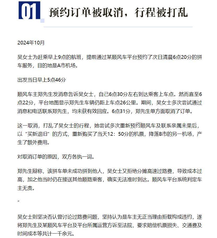 上海,一女子提前一天预约了拼车服务去机场,谁知预订的时间快到了,司机距离女子还有26公里。女子就多催了几次,司机竟直接取消了订单。由于没有其他拼车单,女子只能改签了机票,这导致女子损失了不少钱。事后女子越想越气,便将司机和网约车平台告上法院并索赔,法院判了! 上海的这位女士因为要出远门,提前一天就在某网约车平台上,仔细挑选并预约了一辆拼车,约定好第二天一早的时间出发,直奔机场,想着拼车性价比高,还能准时赶上网机,省心又省钱,她特意反复确认了订单信息,生怕出现差错。 预约当天,女士特意提前收拾好行李,办好网上值机,早早就在约定的上车点等候,生怕自己迟到耽误行程。 可眼看着预订的出发时间一分一秒临近,拼车司机却始终没有出现,她心里开始有些着急,打开平台地图一看,瞬间就慌了神——地图上显示,司机当前的位置,距离她还有整整26公里。 按照正常的路况,就算不堵车,26公里也需要将近四十分钟才能到达,而她的飞机起飞时间越来越近,根本耽误不起。 情急之下,女士只能在平台上多次给司机发消息、发提醒,催促司机尽快赶来,语气里满是急切,可她万万没想到,自己的几次催促,不仅没有让司机加快速度,反而惹恼了对方。 就在女士第三次催促过后,手机突然弹出一条消息,提示她的拼车订单已被司机单方面取消,没有任何解释,没有一句歉意,司机就这么干脆利落地终止了服务。 女士瞬间懵了,反应过来后又急又气,赶紧打开平台重新预约拼车,可当时正是出行高峰,相同路线的拼车单一片空白,根本没有可用的车辆。 她又赶紧尝试预约专车、出租车,可要么是没人接单,要么是报价高得离谱,而且就算能约到,也根本赶不上原定的航班。 看着时间一点点流逝,女士没有任何办法,只能硬着头皮打开购票软件,办理机票改签手续,不仅要支付高额的改签费,还得更改后续的行程安排,一番折腾下来,损失惨重。 顺利赶上网机、处理完事情后,女士越想越气,觉得自己的损失完全是因为司机和平台的过错造成的。司机无故迟到,还因为几句催促就单方面取消订单,没有丝毫责任心; 而网约车平台作为监管方,没有尽到监管义务,任由司机违规操作,才导致自己陷入如此被动的境地,蒙受经济损失。 事后,女士曾联系网约车平台投诉,要求平台出面协调,让司机赔偿自己的机票改签费、额外产生的交通费、误工费以及违约金, 可平台只是简单安抚了她几句,称会对司机进行处罚,却拒绝协调赔偿事宜,甚至表示平台不承担相关责任。而那位取消订单的司机,自始至终都没有主动联系过她,更没有提及赔偿的事。 多次沟通无果,女士彻底被激怒,她觉得自己的合法权益受到了侵害,于是整理好订单记录、聊天截图、机票改签凭证、误工证明等所有相关证据, 正式向上海当地法院提起诉讼,将拼车司机和网约车平台一同列为被告,明确提出索赔要求,包括机票改签费、额外交通费、误工费以及违约金,各项费用合计近万元。 女士满心以为,自己手握充分证据,又确实蒙受了实际损失,法院一定会支持自己的诉求,让司机和平台承担相应的责任,弥补自己的损失。可法院开庭审理后,做出的判决却让她大失所望,甚至十分不满。 法院最终认定,司机单方面取消订单的行为确实存在过错,构成违约,应当承担相应的赔偿责任;但网约车平台仅提供信息匹配服务,并无证据证明平台在此次事件中存在过错,因此驳回了女士对平台的全部诉讼请求。 同时,法院认为,女士在订单被取消后,未采取更合理的补救措施防止损失扩大,因此对其主张的部分损失不予支持,最终判决司机仅赔偿女士部分机票改签费和交通费,共计200余元,驳回了她的误工费和违约金索赔。 对此,你们有什么看法,欢迎评论留言~