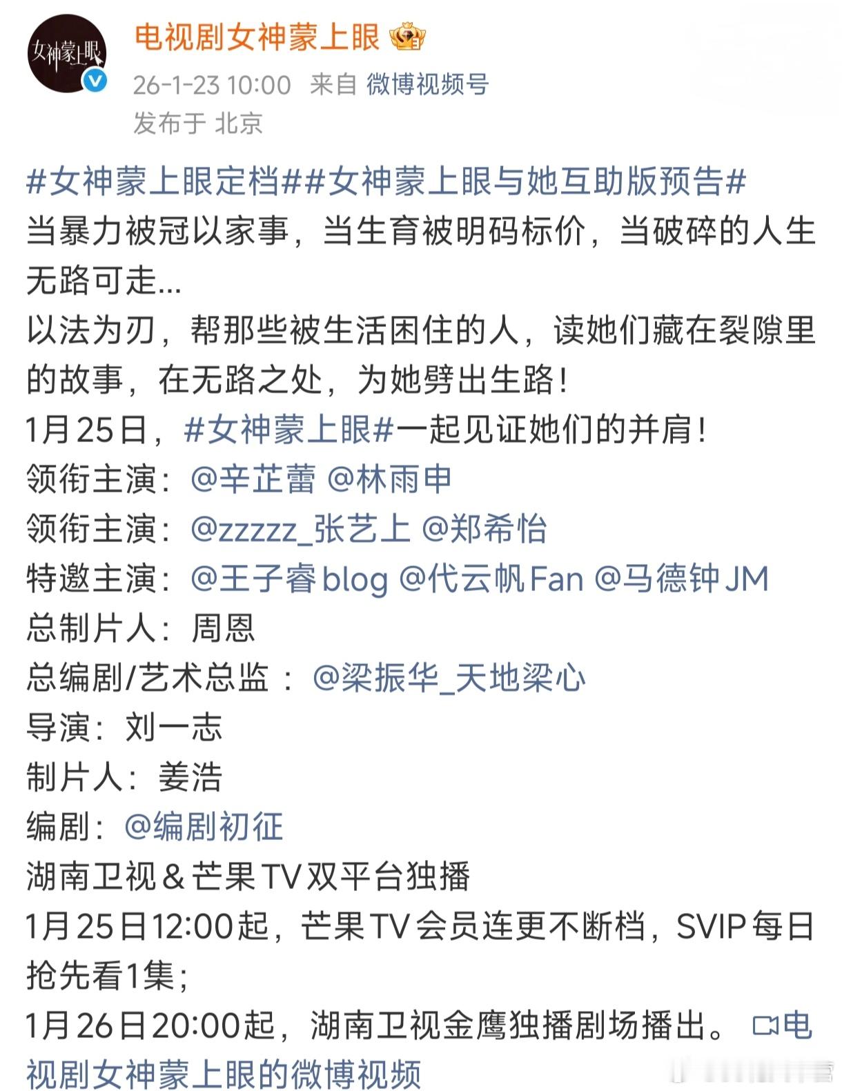 辛芷蕾一番女主新剧《女神蒙上眼》定档!湖南卫视黄金档,1月26日起开播!一线卫视上星剧女神蒙上眼定档