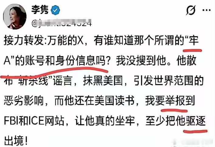 这个我会。现在宣称回中国的牢A只是烟雾弹。什么牢A,磁吸太后,乃木佳子啊!躲在澳大利亚呢。建议美国火速抓她归案每天摸鱼打卡