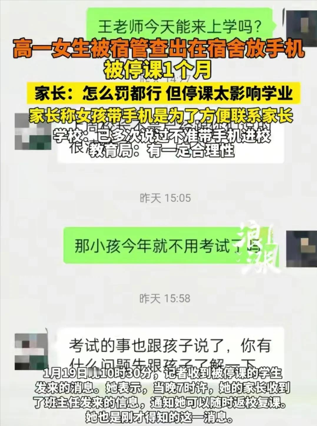 陕西,高一学生带手机去学校,结果被学校停课一个月,家长不乐意了,认为停课时间太长,影响学业,他找熟人找领导说情,但还是被拒绝了,学校表示已经多次说过不准带手机进学校,管理教育的工作人员也表示,这有一定的合理性。 陕西一位家长最近彻底急疯了,自家刚上高一的孩子,因为带手机去学校,就被学校作出了停课一个月的处罚。 为了让孩子尽快返校上课,不耽误学业,家长四处托关系、找熟人,甚至专门找了学校领导说情,可无论他怎么做,都被学校坚决拒绝,丝毫没有商量的余地。 陕西当地一所高中,一名刚升入高一的学生,趁着上学的时候,偷偷把手机带进了校园。孩子的想法很简单,只是想着平时上下学路上能和家长联系,课间休息时能偶尔放松一下,根本没意识到,这个举动会给自己带来停课一个月的处罚。 其实,这所学校早就有明确规定,禁止学生将个人手机带入校园,学校不仅在校园门口、教学楼、宿舍楼等地张贴了相关通知,班主任也在班会、家长群里多次强调,反复提醒学生和家长,不要违反这项规定,一旦发现,会按照学校规章制度进行严肃处理。 可这名高一学生,并没有把学校的规定和老师的提醒放在心上,依旧偷偷携带手机进校园,最终还是被学校管理工作人员发现。 经过核实后,学校当即作出决定,给予这名学生停课一个月的处罚,通知家长尽快来学校接孩子回家,并且明确告知,停课期间,学生不得进入校园,也不能参与学校的任何教学活动。 家长接到学校的通知后,当场就懵了,赶紧赶到学校,试图和学校沟通,希望能减轻处罚,让孩子尽快返校。 家长反复跟学校解释,孩子年纪还小,只是一时糊涂,没有意识到事情的严重性,而且孩子平时表现不算差,请求学校网开一面,缩短停课时间,哪怕停课几天作为警告也可以。 可学校方面态度十分坚决,明确表示,学校的规定早就深入人心,之前已经多次提醒过学生和家长,禁止带手机进校园, 这名学生是明知故犯,必须按照规定进行处罚,这样才能起到警示作用,也能维护学校正常的教学秩序。无论家长怎么恳求,学校都没有松口。 看着学校坚决的态度,家长心里又急又气,他深知高一阶段对孩子的重要性,停课一个月,孩子的学业肯定会受到严重影响。 情急之下,家长想到了托关系找熟人,他四处打听,联系到了认识学校相关领导的熟人,专门带着礼品上门求助,希望对方能帮忙说句话,让学校放宽处罚。 不仅如此,家长还专门找了学校的领导,当面说情,反复强调孩子的情况,诉说自己的焦虑,甚至提出愿意配合学校,加强对孩子的教育, 保证孩子以后再也不会带手机进校园。可即便做到这份上,学校领导依旧没有动摇,还是委婉却坚决地拒绝了家长的请求。 学校领导表示,学校的规章制度面前人人平等,不能因为个人说情就破坏规定,否则以后很难再约束其他学生。 而且学校作出停课一个月的处罚,并不是一时冲动,而是经过慎重考虑的,目的就是为了让学生深刻认识到自己的错误,也给其他学生敲响警钟,杜绝类似的情况再次发生。 负责学校管理教育的工作人员,也针对此事作出了回应,称学校的这项处罚有一定的合理性。现在很多学生带手机进校园, 上课偷偷玩手机、课间沉迷手机,严重影响学习效率和课堂秩序,也不利于学生的视力保护和身心健康,学校必须采取严格的管理措施,才能引导学生专心学习。 目前,这名高一学生已经在家停课多日,每天只能在家自学,可没有老师的指导和课堂的氛围,学习效果大打折扣,家长看着孩子的状态,满心焦虑却又无计可施。 家长表示,实在不行,会考虑向当地教育部门反映情况,寻求帮助,希望能让孩子尽快返校上课。 此事被身边人传开后,也引发了不少人的讨论,有人理解学校的严格管理,觉得现在学生确实容易沉迷手机,需要严厉约束; 也有人觉得学校处罚过重,毕竟孩子还小,停课一个月太影响学业。而涉事学校,至今依旧坚持自己的处罚决定,没有任何松动的迹象。 对此,你们有什么看法,欢迎评论留言~