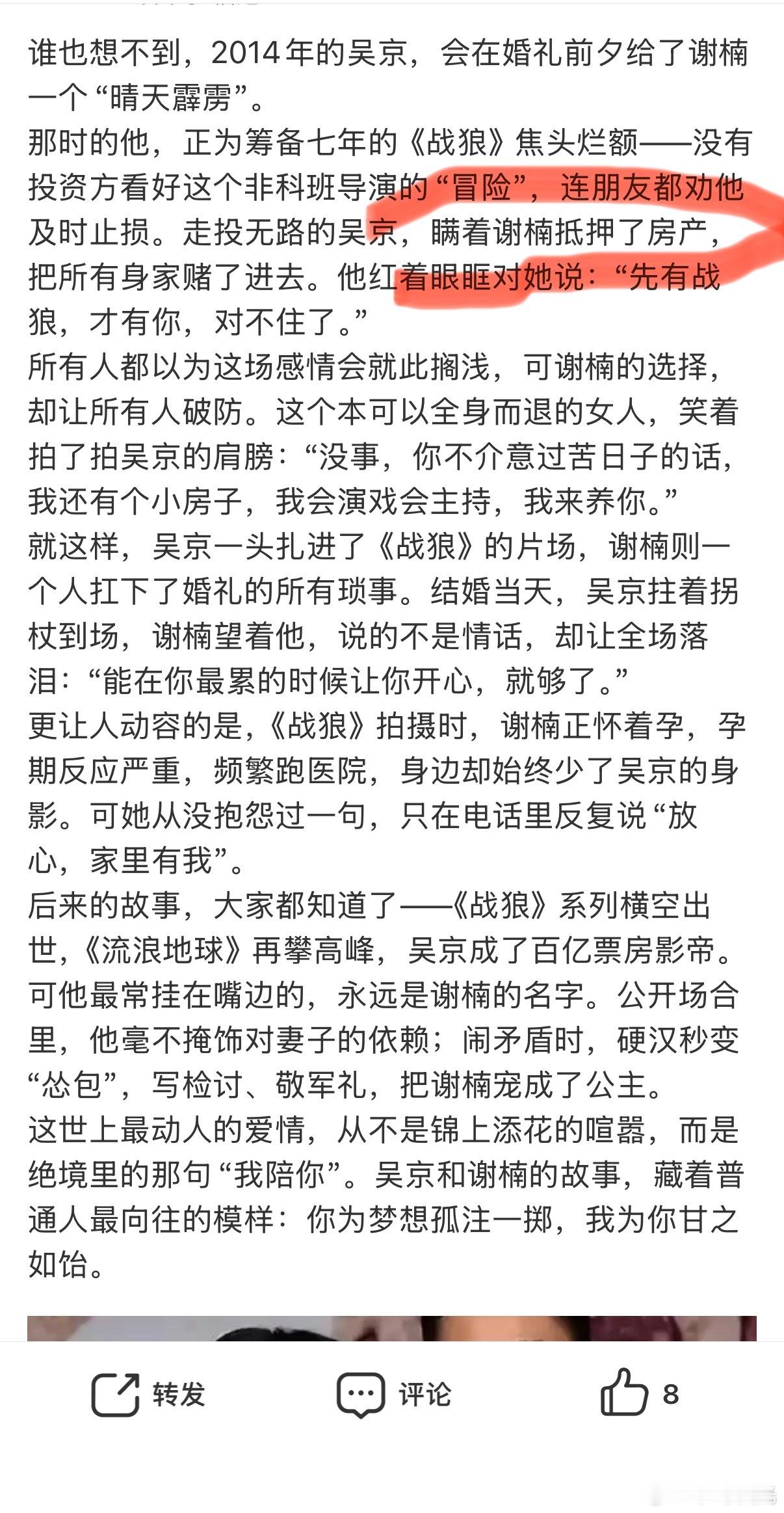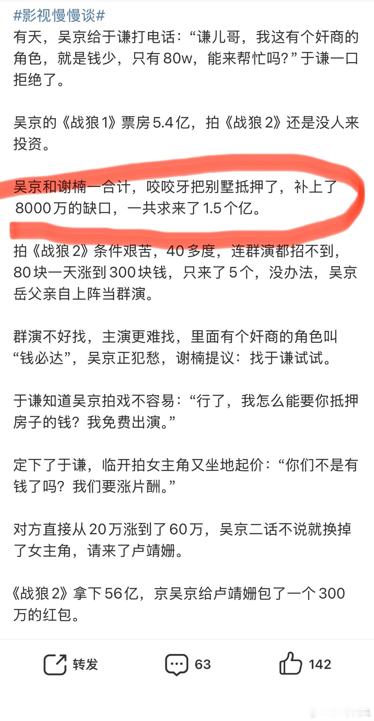 吴京只要拍电影,就会抵押房子…《战狼》抵押别墅,这次《镖人》又抵押了房子,我很费解这样的消息真的有人信吗?搞不懂一些自媒体的创作逻辑…