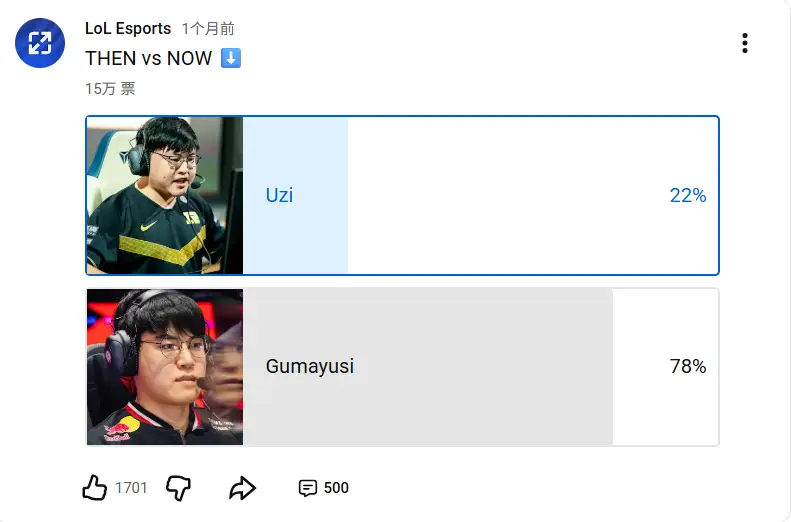 LOL官方发起“过去vs现在”投票:Gumayusi大幅领先Uzi在大约15万投