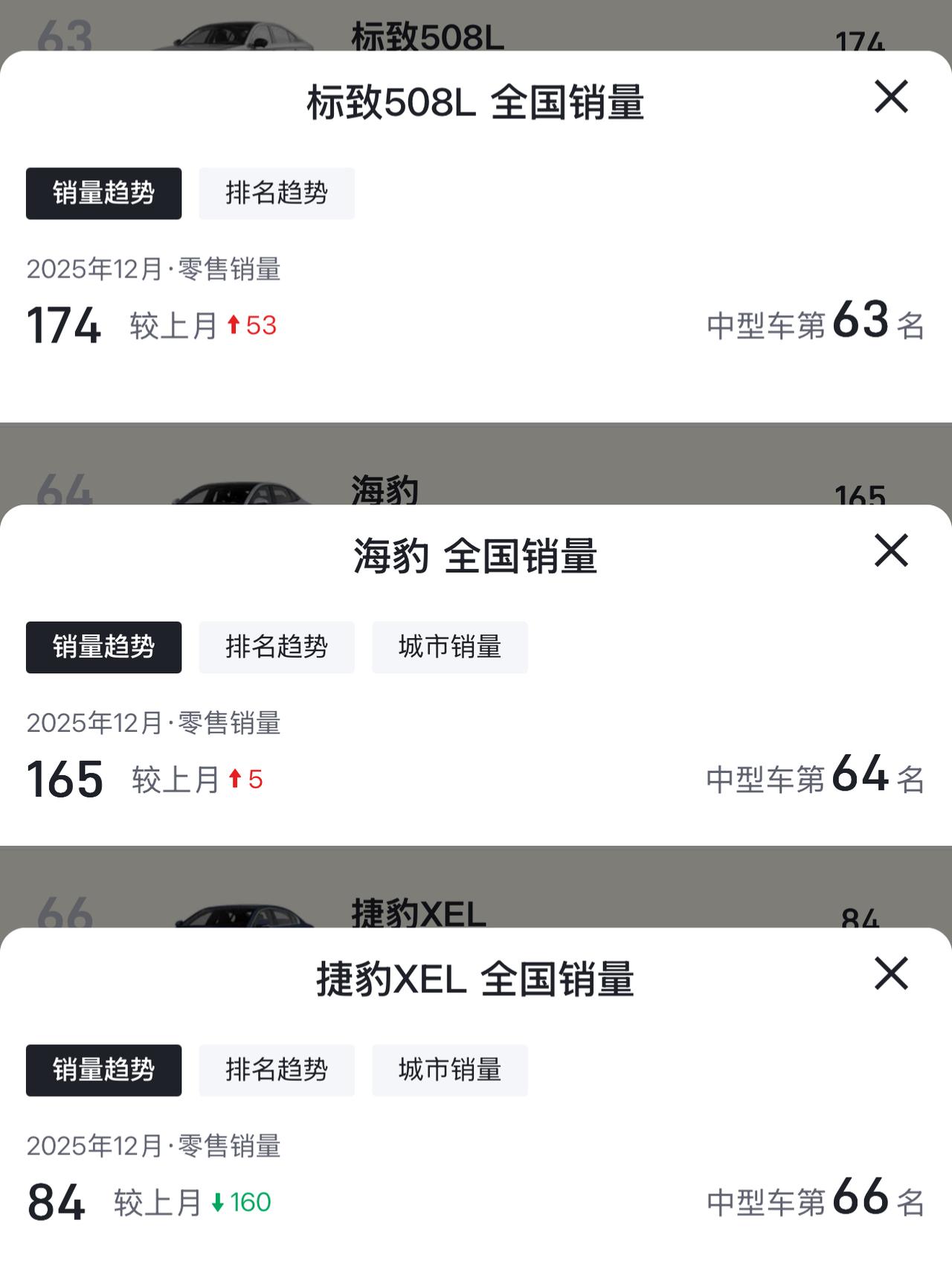 标致508L,海豹EV(水滴豹),捷豹XEL,迈锐宝XL,这几个底盘都能排上号,为啥这几个销量都如此惨淡呢?标致和捷豹可以理解为品牌小众,迈锐宝停产状态,但海豹总不至于吧?【来自懂车帝车友圈】