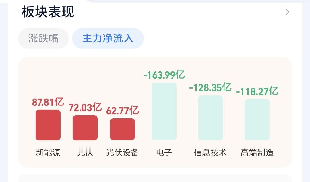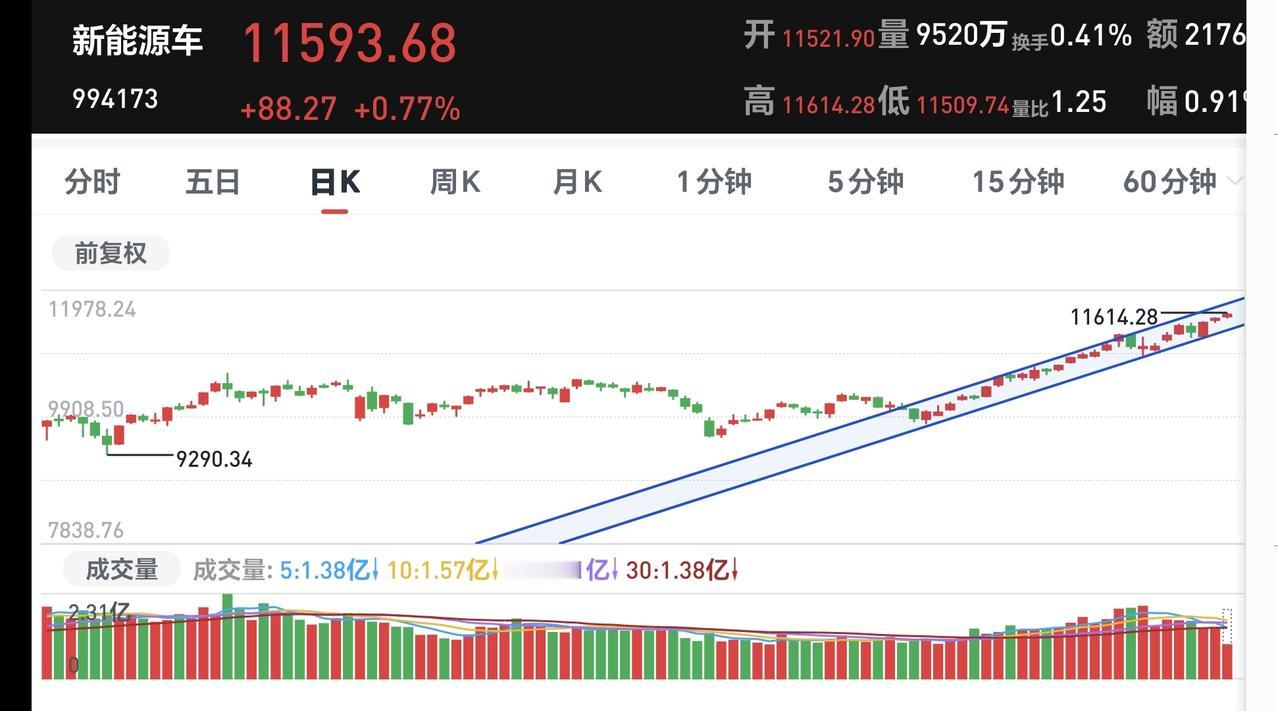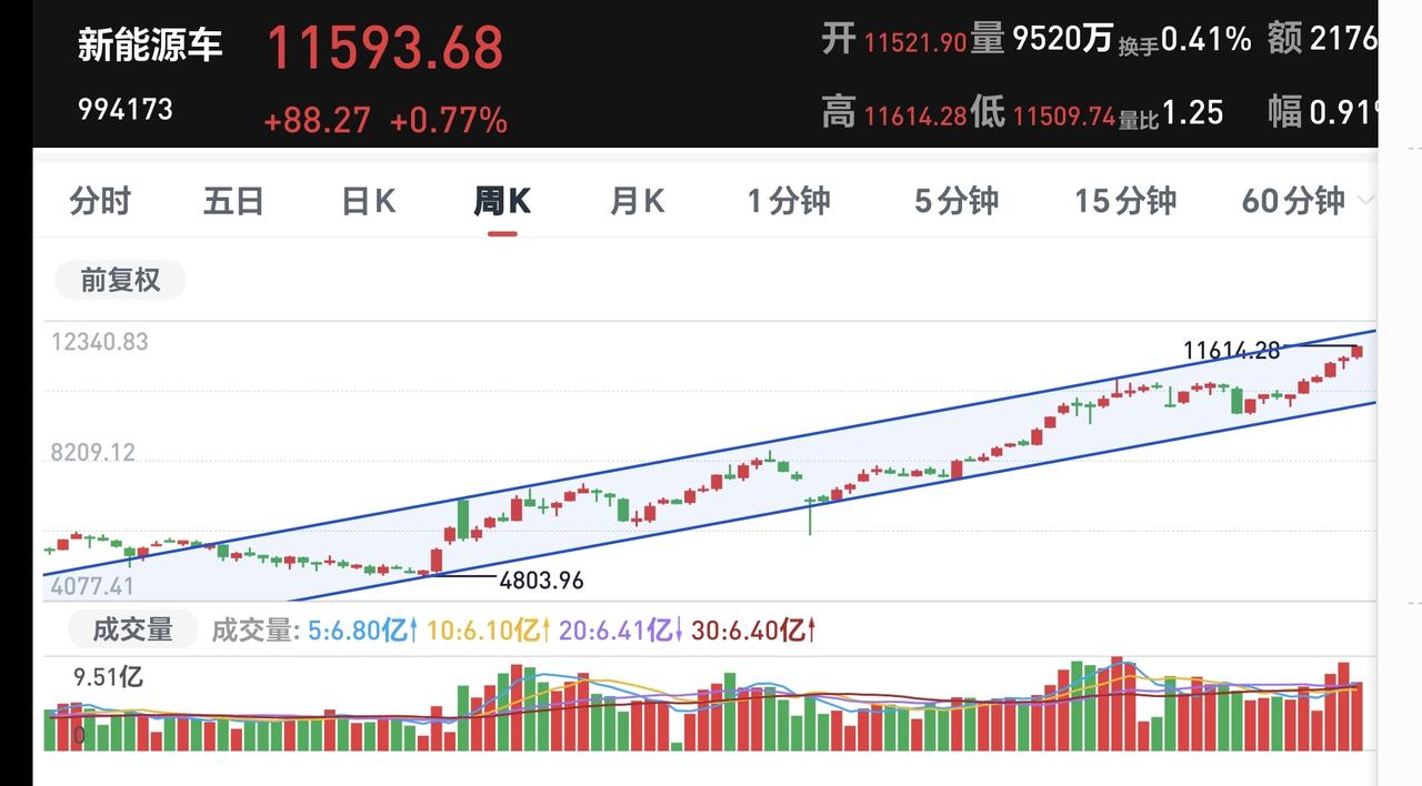 基金:新能源板块大涨,究竟应该怎么办 市场每天都有买卖,资金每天都有进出,对于板块也是这样的,今天资金净流入最多的三个板块是:新能源板块,光伏板块,光伏设备板块,主力资金净流出最多的三个板块是:电子板块,信息技术板块,高端制造板块。 今天主力资金净流入最多的是新能源板块,看下面的截图2,这是新能源车板块日K线图,这个板块日线级别处于上涨趋势中,今天的上涨并没有改变这样的上涨趋势,今天的涨跌都改变不了日线级别的上涨趋势,所以,这个板块今天不管是涨和跌,都不影响我们的操作策略。 看下面的截图3,这是新能源车板块的周K线图,这个板块周线级别也同样是处于上涨趋势中,今天的涨跌也同样是不能改变周线级别的上涨趋势,长线持有的人完全可以继续持有,除非这样的上涨趋势被改变。 许多人说技术没有用,很多人说画线没有用,技术是有用的,技术有可能只是对你没有用,因为,运用技术挣钱都是挣的慢钱,而你要想要的技术,是那种可以挣快钱的技术,是那种稳赚不赔的技术,你要的那种技术是没有的,达不到你要求的技术,并不是没有用,而是对你没有用而已。 技术的运用也只是概率的问题,技术并不是100%的准确,比如说,新能源车板块如果现在跌破日线级别上涨通道的下轨,技术上讲是上涨趋势被破坏了,后面大概率会下跌,但也有可能不会下跌,也有可能下跌了以后会重新回到上涨通道内,这就是小概率,小概率的事情不是不可能发生,只是发生的可能性会小一点。 如果想挣快钱,没有这样的技术,如果想挣那种赚多赔少的钱,那你就要用技术,但这样的挣钱是挣慢钱,这样的挣钱挣挣小钱,没有一夜暴富,没有一飞冲天,挣慢钱的稳定性大一点,挣快钱容易一泻千里。 大家帮忙评论,点赞,分享和转发,谢谢大家的支持。
