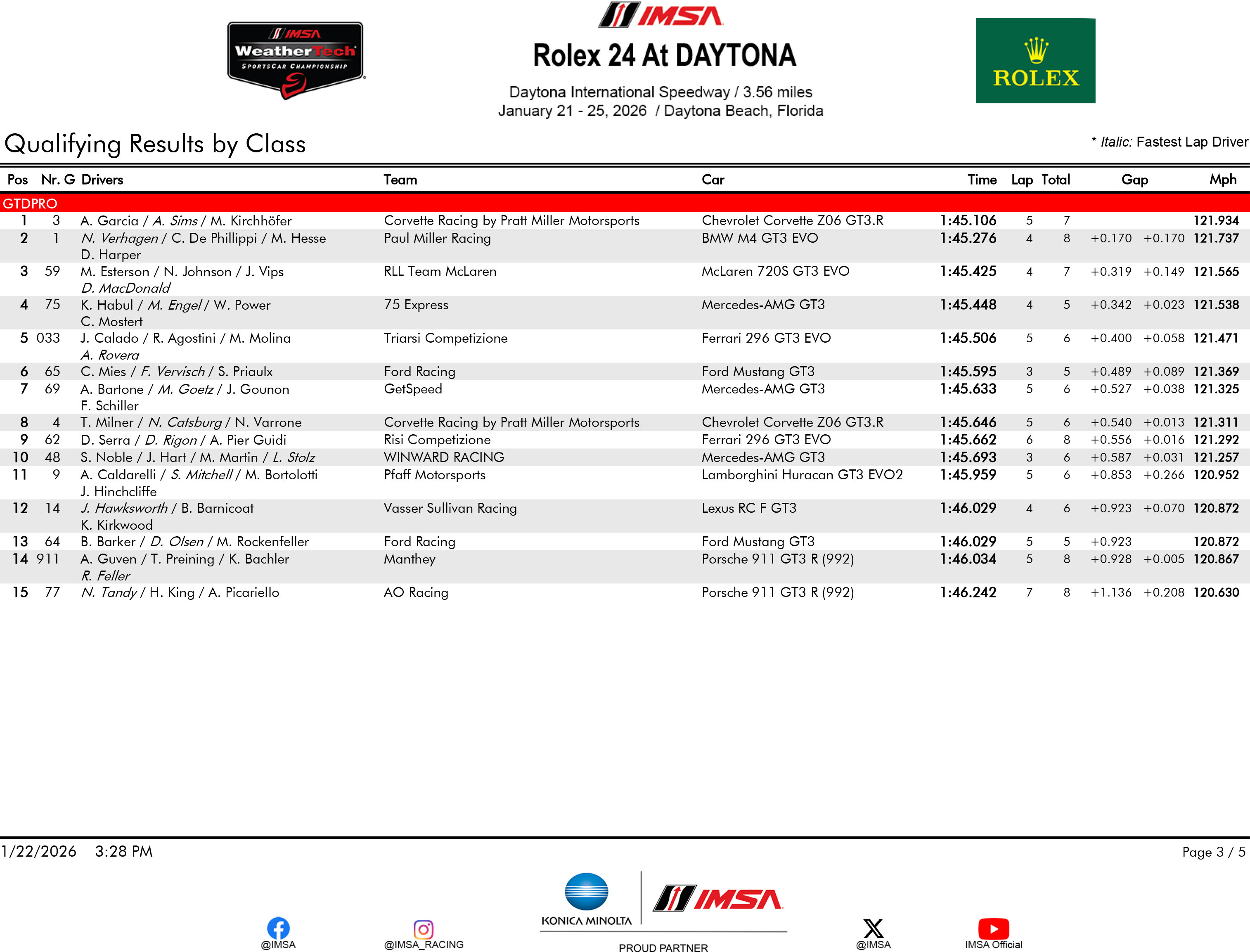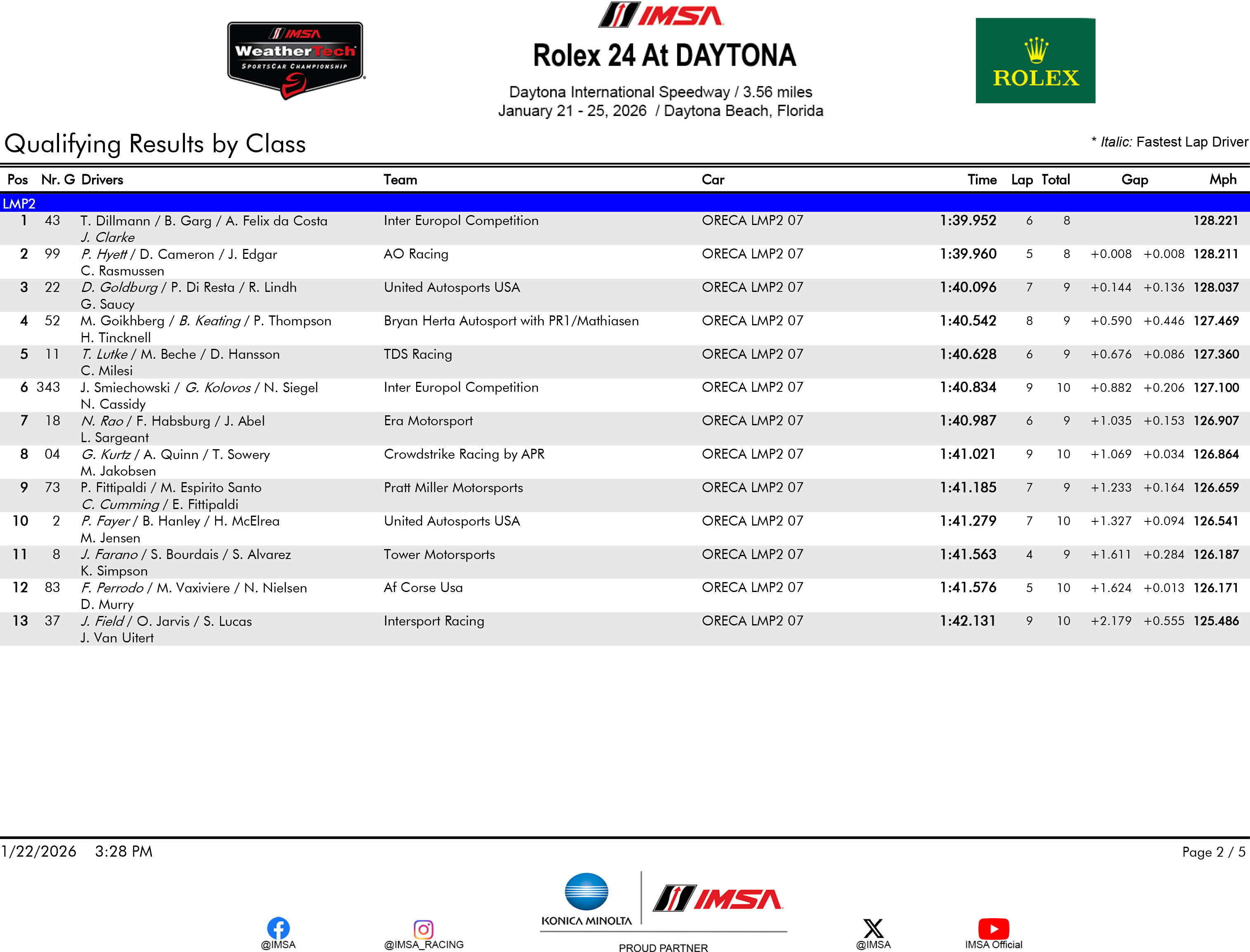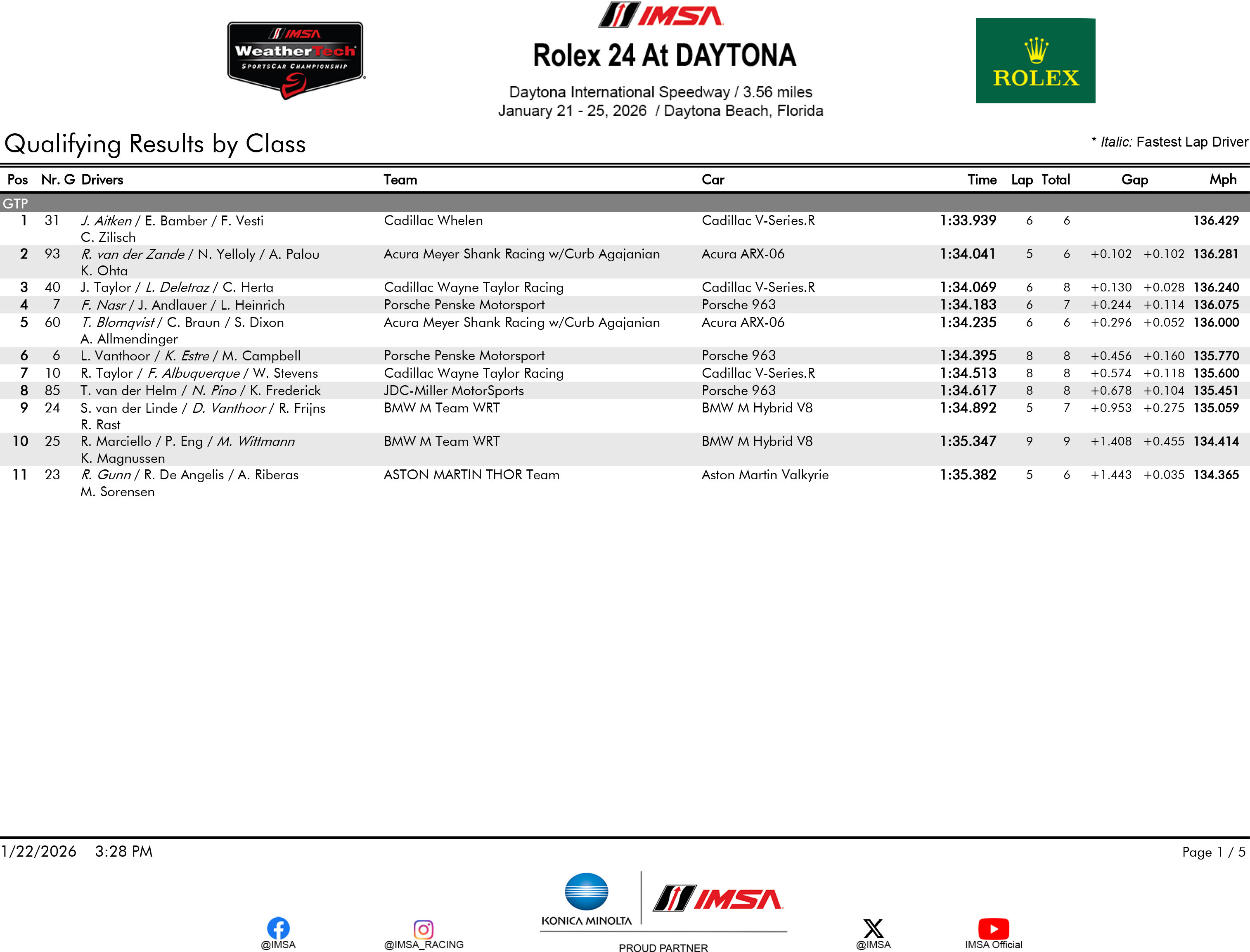 讴歌拿下2026戴通纳24小时耐力赛杆位⚪️AXR凯迪拉克原本夺得杆位,但由于车底防滑块磨损过度,车检没有过,取消了成绩,范德赞德驾驶的93号讴歌ARX-06成为新杆位车组,成绩1分34秒041👀凯迪拉克、讴歌和保时捷差距很小,宝马稍微落后,差异达到0.8秒,女武神落后1.3秒,目前的消息是正赛BoP不会改变,但各家真正实力如何,还要看正赛表现🔵LMP2杆位由Inter Europol拿下;🔴GTD Pro组别西姆斯驾驶科尔维特拿到杆位,迈凯伦前排起跑,原本第二的宝马由于轮胎倾角超过限度取消成绩,两台保时捷垫底🟢GTD组赛车之心27号杆位,叶一飞所在的023号车组第十一起跑