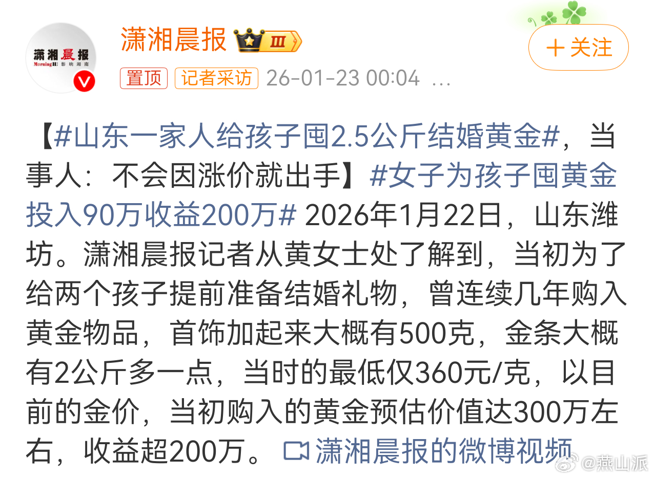 女子为孩子囤黄金投入90万收益200万 能拿90万去买黄金,肯定不是一般家庭,估计人压根不在乎这点收益。以前老是听人说“有钱人的钱会生钱”还不明白是啥意思。现在算是明白了,即便黄金、白银这些贵金属涨得再猛,咋普通老百姓最多就是投几万进去,赚不了几个钱不说,还有可能大出血,甚至伤筋动骨。而有钱人一投就是大几十万甚至上百万,赚了就是一大逼,亏了人也不至于伤筋动骨。所以,大家伙透支需谨慎,不要意气用事,一定要冷静思考。