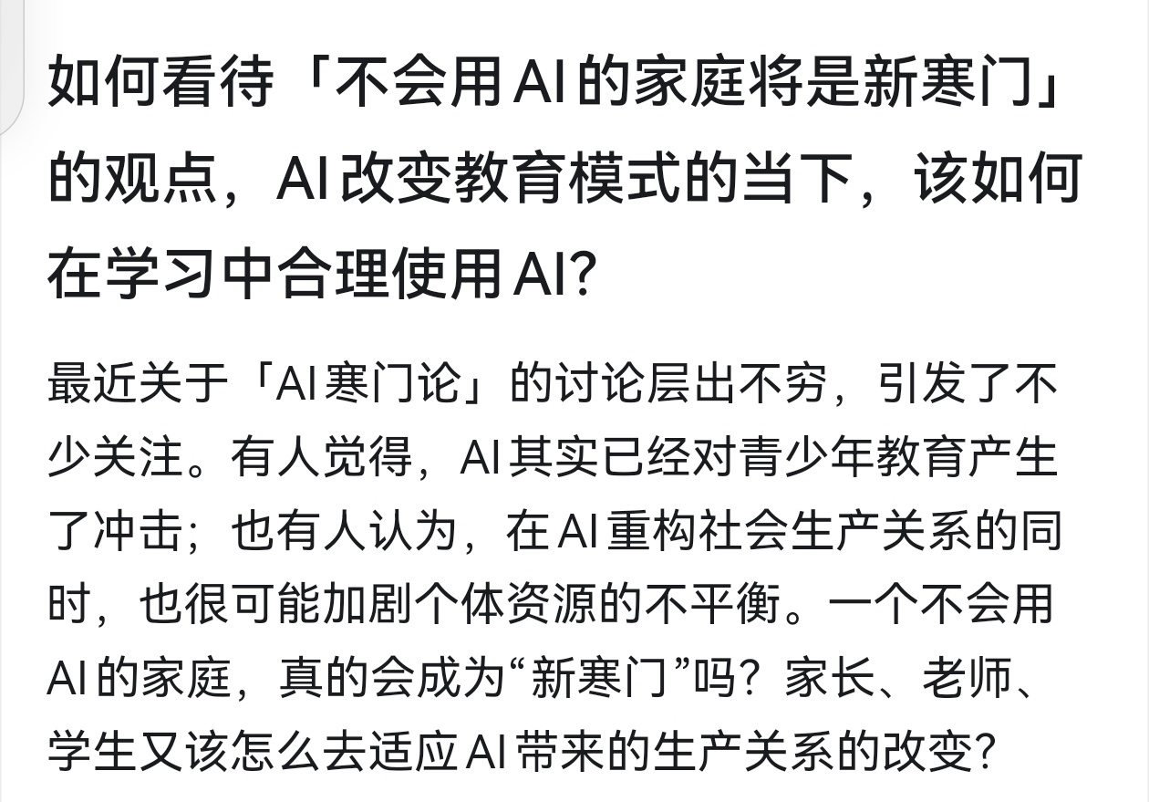 不会用AI的家庭将是新寒门吗 AI给教育最大的变化是思维,学会如何问才是AI时代的精髓。就像大家说的它不该是家长甩锅的工具,而是我们陪着孩子一起探索世界的伙伴让孩子按自己的步调,和AI一起慢慢长大,我认为这才是最踏实的教育方式
