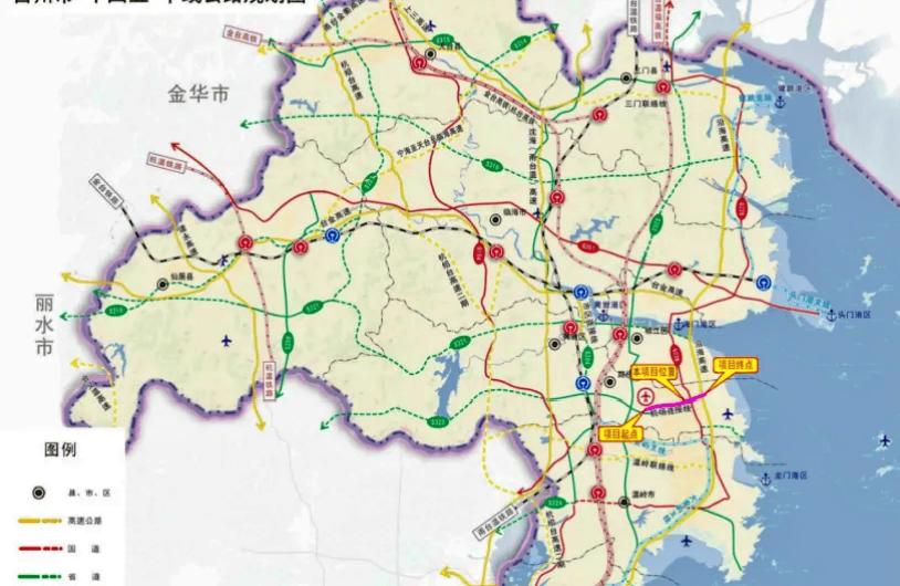 【甬莞高速公路台州机场支线新建工程】正在抓紧开展工作。项目全长约9千米,总投资约27亿元。起于路桥区机场进场道路与东方大道交叉处,止于甬莞高速东侧,采用双向四车道标准建设,设计时速100千米。设置桥梁5座7909米,枢纽立交1处(山下李),互通立交2座(路桥,228国道),收费站2处。项目的建设有利于完善浙江高速公路网结构,串联甬台温高速、沿海高速、台金高速,缓解区域交通压力,助推低空经济发展,促进地方经济社会高质量发展。