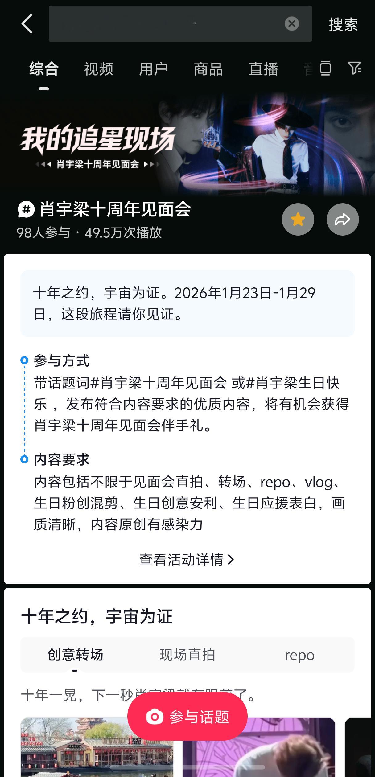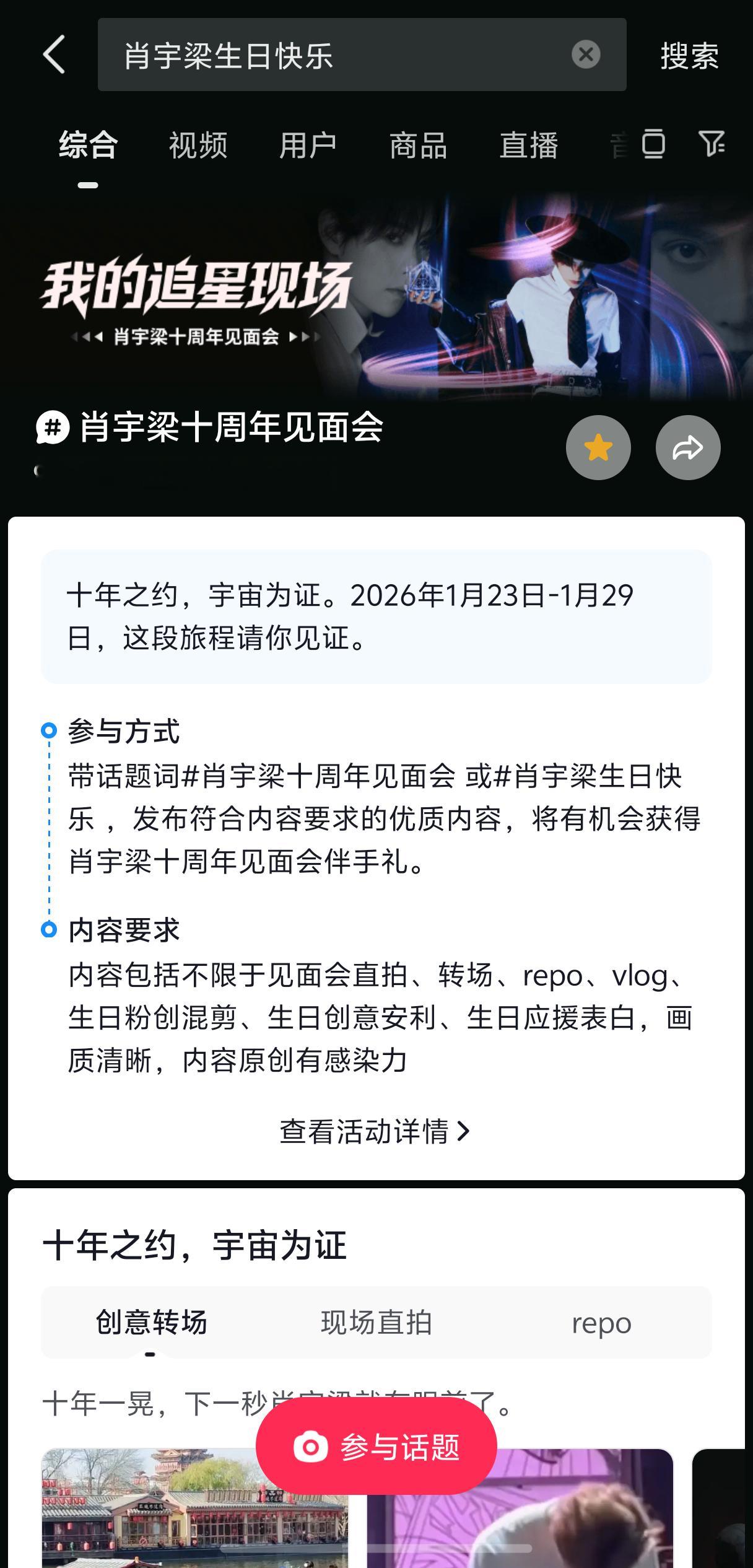 抖音见面会活动已上线啦!大家都来搜一搜搜索【肖宇梁生日快乐】或【肖宇梁十周年见面会】或【肖宇梁见面会】,即会跳转活动页面🎊‼️参与方式:带话题词【肖宇梁十周年见面会】或肖宇梁生日快乐 】,发布符合内容要求的优质内容,将有机会获得肖宇梁十周年见面会伴手礼‼️内容要求:内容包括不限于见面会直拍,转场,repo,vlog,生日粉创混剪,生日创意安利,生日应援表白,画质清晰,内容原创有感染力。大家看到都来参与哇!都来好好安利我们肖宇梁十周年见面会精彩瞬间哇肖宇梁0123生日快乐肖宇梁十周年见面会超友趣嗨玩局 【肖宇梁CALL ME X见面会|宇航员高光时刻】