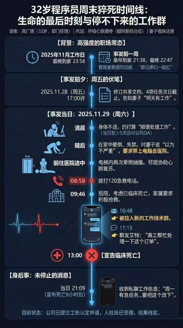 一个上市公司部门经理,2万的工资,被压到这个份上,早就该跑路呀,多少人连工作都没有,他一个人干6人份的!猝死程序员公司赔付家属39万一本《恭喜你当上主管了》的书和多劳多得的机制,将超负荷工作包装成个人奋斗的奖赏;而当事人临终前那句带上电脑,则像一句被职场文化彻底征服的“敬业”谶语。他认为要体谅下属,自己却困在无人体谅的系统里。39万人道主义抚恤金背后,是企业将工伤认定拖入模糊地带的精明算计,用一笔远低于法定工伤赔偿的金额,试图买断一个生命的所有价值。白领尊严的假象,月入两万的经理,底薪仅三千,本质仍是按件计酬的数字化劳工。当奋斗异化为对基本生存权的剥夺,当协作意味着24小时待命。社会的反思不能止于同情。必须追问,当加班文化戴上“敬业”面具,劳动者该如何夺回自己时间的所有权。视源股份回应程序员猝死猝死程序员底薪3千干7个人的活猝死程序员有本书叫恭喜你当上主管了