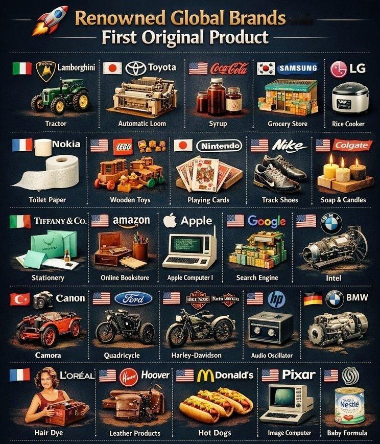 全球知名品牌的首个原创产品1. 兰博基尼 → 拖拉机2. 丰田 → 自动织机3. 可口可乐 → 糖浆4. 三星 → 杂货店5. LG → 电饭煲6. 诺基亚 → 卫生纸7. 乐高 → 木制玩具8. 任天堂 → 扑克牌9. 耐克 → 跑步鞋10. 高露洁 → 肥皂和蜡烛11. 蒂芙尼 → 文具12. 亚马逊 → 网上书店13. 苹果 → 苹果电脑14. 谷歌 → 搜索引擎15. 英特尔 → 内存芯片16. 宝马 → 飞机引擎17. 佳能 → 照相机18. 福特 → 四轮摩托车19. 哈雷戴维森 → 赛车摩托车20. 惠普 → 音频振荡器21. 欧莱雅 → 染发剂22. 雷诺 → Volutrette 1CV23. 胡佛 → 皮革制品24. 麦当劳 → 热狗25. 皮克斯 → 图像计算机26. 雀巢 → 婴儿配方奶粉冷知识