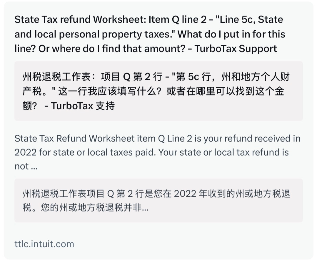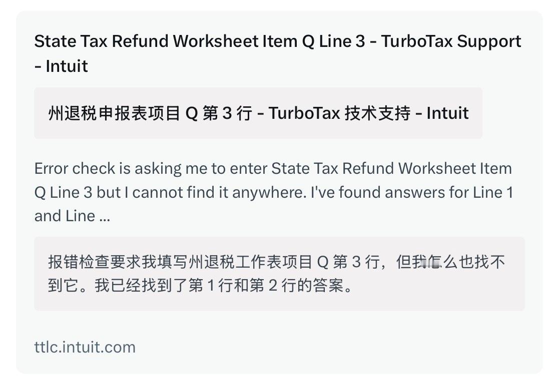 🔻item Q 本来就是报税的TurboTax软件特有的内部标签。🔻这个工作表不是IRS官方1040表格上的公开一行,而是TurboTax(或类似软件)内部用来辅助计算的worksheet。 🔻这个工作表是用来计算你从州或地方政府收到的税款退税(通常来自1099-G表格)是否需要计入当年联邦应税收入的。 🔻有些美国用户在报错信息的相关提问中会习惯性的这么叫 Item Q,局限于TurboTax社区、JustAnswer等地方,很小众的词,在IRS官方表格里没有这个“Q line”的说法。 🔻Item Q 是工作表里的一个大项(Section/Item),下面分Line 1/2/3……🔻把 state tax refund, item Q, line * 断句成“Q line”,然后创造性的发明了“Q line”替贝森特辩解,有些不懂装懂、靠搜索引擎找答案的id还是蛮精彩的。热点现场海外新鲜事美国人在线求助