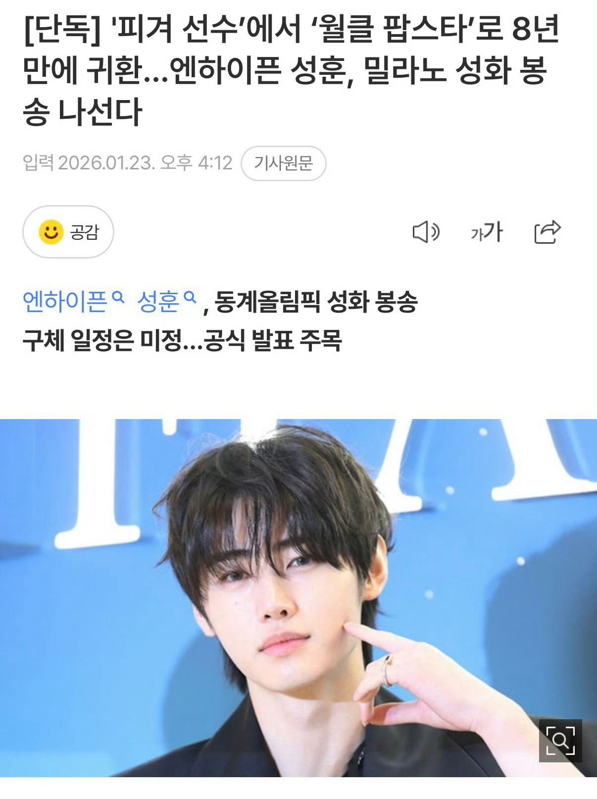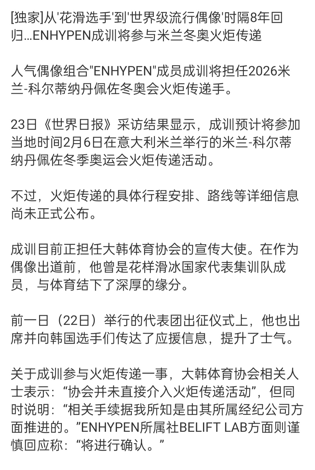 朴成训2026米兰冬奥会火炬传递手人气偶像组合"ENHYPEN"成员成训将担任2026米兰-科尔蒂纳丹佩佐冬奥会火炬传递手。23日《世界日报》采访结果显示,朴成训预计将参加当地时间2月6日在意大利米兰举行的米兰-科尔蒂纳丹佩佐冬季奥运会火炬传递活动。