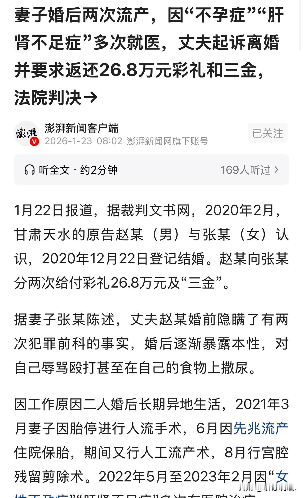 甘肃天水,女子与男子结婚,男子给了女子26.8万彩礼和三金。谁知,婚后不久,男子就开始对女子打骂,还在她的食物里撒尿。女子先后两次流产,还患上了不孕症。男子起诉离婚,要求女子返还26.8万元彩礼和三金。法院这样判了。 2020年2月,张某已到适婚年纪,常言道“一家女,百家求”,家里的门槛都快被上门提亲的媒人踏平了。 在众多相亲对象里,心高气傲的张某一眼就看中了赵某。 赵某能言善道,很会讨女孩子欢心,两人相处不过10个月,便在2020年12月22日领了结婚证。 赵某一家对张某十分看重,不仅分两次给了她26.8万元彩礼,还精心置办了“三金”,这份诚意让张某满心欢喜,以为自己嫁对了人,往后便是幸福日子,却没料到,这竟是一场噩梦的开端。 恋爱时的甜蜜滤镜褪去,婚姻终究要回归柴米油盐的平淡日常,可张某渐渐发现,赵某和婚前判若两人。 只要夫妻俩有一点小矛盾、小摩擦,赵某就会变得暴躁易怒,起初只是骂骂咧咧,后来逐渐升级为恶语相向,到最后甚至会对她动手动脚,昔日的温柔体贴早已消失得无影无踪。 更让张某崩溃的是,她发现丈夫经常在她的食物里撒尿,张某心里感到无比恶心,对丈夫失望至极。 直到这时张某才知道,赵某婚前竟有两次犯罪前科。 意外的是,知道赵某的人品后,张某没有果断选择离婚,而是选择了隐忍。 好在,两人工作地点不同,经常异地生活,这让张某也有了喘息的机会。 谁知,在2021年3月,张某怀孕后不幸胎停,只能无奈做了人流手术。 仅仅三个月后,她再次怀孕,却出现了先兆流产的症状,只能住院保胎,可最终还是没能保住孩子,又一次经历了人工流产的痛苦。 到了8月,因为之前的手术留下了后遗症,她又不得不接受宫腔残留剪除术,短短半年时间,三次手术让她的身体遭受了巨大创伤。 本以为调养一段时间就会好转,可命运却再次给了张某沉重一击。 从2022年5月开始,她因为身体不适去医院检查,被诊断出“女性不孕症”和“肝肾不足症”,之后的大半年里,她频繁往返医院接受治疗,药吃了不少,罪也受了不少,可病情却始终没有明显好转。 而在她最需要丈夫陪伴和照顾的时候,赵某却显得格外冷漠,甚至对她的痛苦视而不见。 长期的家暴、丈夫的隐瞒与冷漠,再加上身体上的病痛,让张某对这段婚姻彻底失去了希望。 可没想到,2023年11月,赵某竟然先一步向法院起诉离婚,或许是当时证据不足,法院最终驳回了他的离婚请求。 离婚没成,赵某就开始刻意躲避张某,2024年4月,张某想找赵某好好沟通一下后续事宜,可无论她怎么联系,赵某都避而不见,完全没有一点夫妻情谊。 就这样僵持到2025年7月,赵某再次向法院提起诉讼,这次他不仅要求离婚,还提出了一个让人意想不到的诉求,让张某全额返还当初给的26.8万元彩礼和“三金”。 2025年9月,法院经过审理,最终判决准予两人离婚,但对于彩礼返还的问题,并没有支持赵某的全部请求。 法院审理后认为,张某在婚姻存续期间多次流产,之后又因为后遗症长期就医,无论是身体还是心理都受到了极大的伤害,这是不容忽视的事实。 同时,结合两人共同生活的时长、彩礼的具体数额,以及赵某婚前隐瞒犯罪前科、婚后存在家暴等过错行为,综合考量后,法院酌定张某返还赵某9万元及“三金”。 对于这个判决结果,张某并不服气,她觉得自己在这段婚姻里受尽了委屈和伤害,不应该再返还彩礼,于是提起了上诉。 可二审法院经过审理,维持了原判,这个结果也意味着张某必须按照判决履行返还义务。 对此判决结果,网友给出了自己的看法: 这种情况下彩礼不该返还。如果是女子不愿意生孩子而主动流产则另说。女的是被动流产而且身体已经大受伤害,说不定她的流产还有可能是因为丈夫的因素造成,应该还要赔偿身体损伤 个人觉得法院判的多少有问题,我是男的,但我认为判离婚正常,因为男的有暴力倾向,特别哈撒尿在女方食物上进行侮辱。赔偿应该判男方进行给女方赔偿精神损失,营养补贴等,因为女方是婚后怀孕只是因为不幸进行了两次人流,还给女方造成了不可逆转的身体健康。个人观点。