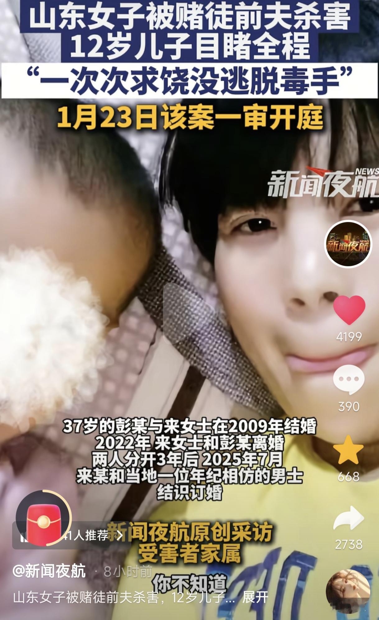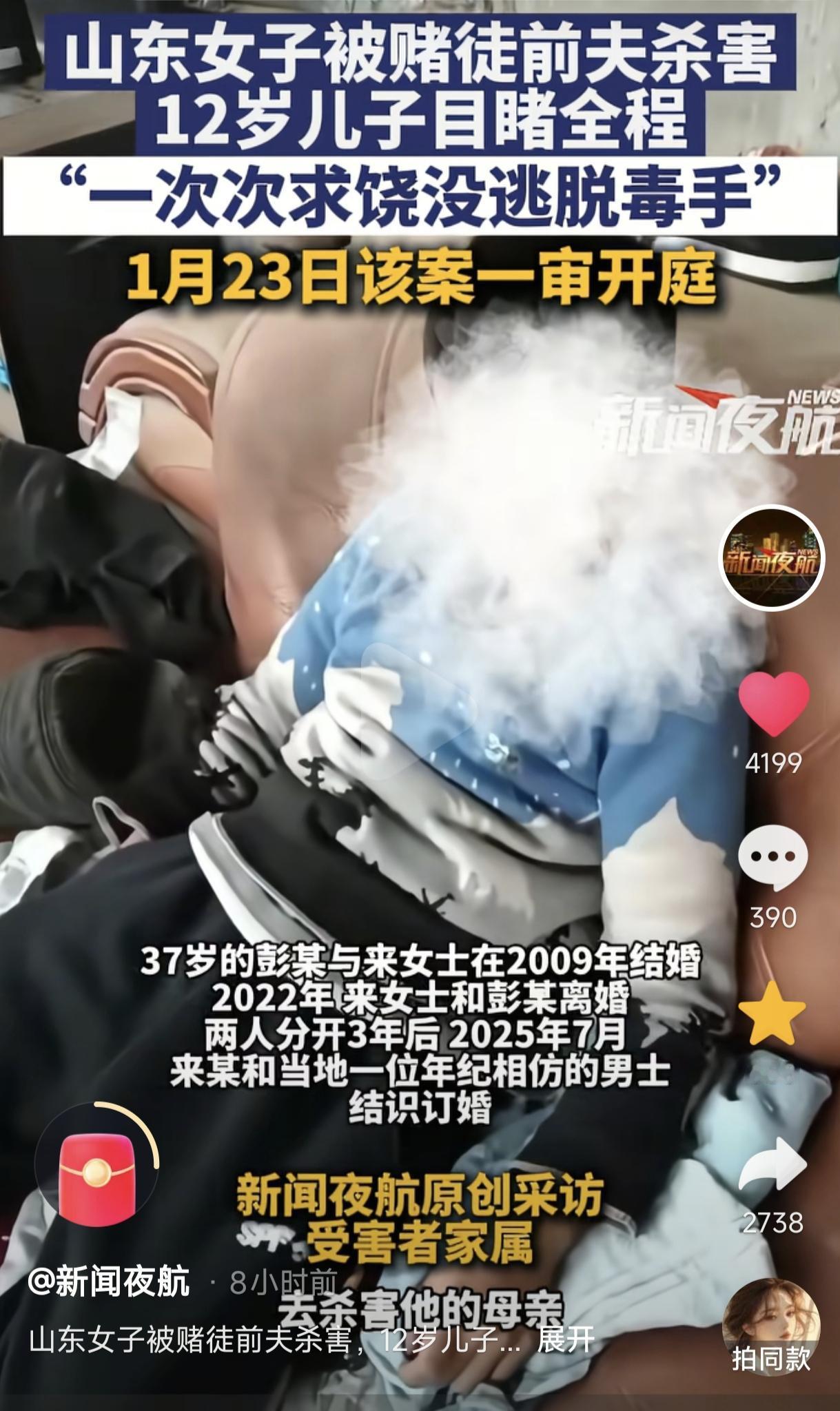 山东34岁女子被赌徒前夫捅20多刀致死案中,凶手真是太凶残了,竟当着12岁孩子面残忍杀害了他妈妈,这对孩子的伤害是终生且不可逆的,估计一辈子都难以走出失去母亲的阴影与痛苦。 而当12岁儿子愤怒地责问彭某:“为什么要杀了我妈妈?”彭某竟然厚颜无耻地狡辩:“谁让她找了别人!” 这就奇怪了,来女士与彭某早在2022年就已经离婚各自安好了,到2025年8月10日被害这天两人已离异了3年多早就不是夫妻关系了,单身几年的来女士为什么不能寻找自己的幸福? 而之所以导致彭某心生杀念,还是源于这样一个导火索...... 2025年7月来女士结识了一个年龄相当的男子并与之订婚,按说这是正当婚恋,但是生活过得落魄、心胸狭窄的前夫彭某得知后,顿时心生怨妒,不仅经常打电话骚扰来女士,还发不堪入目的语言支辱骂她,这真是把厚颜无耻诠释得淋漓尽致! 2025年8月10日这天晚上,怀恨在心的彭某携带着水果刀前往女士家,他以看望儿子为由骗来女士开门,来女士心知前夫德性,并没有开门。 但儿子不知情,被父亲诱骗着开了门,一开门彭某就质问来女士能不能复婚,见对方没有答复,彭某恶向胆边生掏出水果刀捂住来女士口鼻就开始捅,捅了4刀。 一旁的孩子吓坏了,赶紧跑过去试图阻止父亲伤害妈妈,但被彭某一把推开,之后彭某将来女士拖拽到卧室里连续捅刀,不顾儿子在门外哀求。 由于客厅里装了监控,监控里明显能听到女士在卧室里的求饶声,她生前的最后一句话令人泪奔不已:“小孩还在旁边,求求你别动刀行不行?我不敢了,你放过我吧?” 她又让客厅里的孩子跑出去喊人来救命。 但凶残至极的彭某并没有给前妻一丝生还的机会,他凶残至极地连捅来女士24刀,之后奄奄一息的来女士爬到卫生间门口挣扎了20多分钟,便永远闭上了双眼。 而全程彭某都表现得十分凶残与冷酷,甚至在来女士濒临死亡时,还在一旁冷眼相看,没有一丝怜悯之心,更没有采取任何施救措施,简直就是禽兽不如! 经鉴定,来女士身上一共被彭某刺了28刀,5刀致命伤,多处贯穿伤,死因是利器刺入胸腹致心脏破裂,两人毕竟曾是夫妻,究竟有多大仇恨才能如此决绝且凶残? 11岁儿子目睹母亲被害全过程,精神崩溃到极致,出现抑郁与失眠等症状,他经常幽幽地问自己的舅舅:“是不是我不开门,妈妈就不会死了?” 言语间充满了自责,这种亲历性创伤对孩子的打击可谓是毁灭性的,看得人潸然泪下。 其实孩子开不开门,就彭某凶残的德性来看,来女士怕也是凶多吉少,那个恶魔就是本着得不到也要毁掉的原则来对待前妻的,根本不给她任何生还的机会。 至于彭某为何要杀害来女士,其实并不是他有多爱来女士由爱生恨,我认为他就是想长期绑架来女士让她一直给他钱满足赌B欲望。 来女士是一位性情温良的人,每天打两份工,白天主业,晚上兼职,勤勤恳恳地操持着家庭,是一位十分难得的贤妻良母。 彭某呢,拒孩子舅舅称,彭某之前人还不错,后来染上赌瘾成了一个十足的赌徒,每天游手好闲不说,还把妻子辛苦挣来的钱拿去挥霍掉,长期下来便欠下了百万赌债,来女士只得选择卖掉房子替夫还债。 但彭某非但不感恩,反而变本加厉,赌性不改,来女士只得打多份工来为他还债。2025年来女士还清债务后选择考虑个人问题,于2025年7月与一位年龄相当的男子结识,谁知两人订婚还不到1个月,悲剧就发生了~ 可怜的来女士,结婚后一直辛苦地支撑着家庭,每天打多份工,还要替赌徒丈夫还债,没过过一天好日子,没想到换来丈夫对她的残忍杀害,真是太没天理了! 而彭某犯罪并非临时起意,而是蓄谋已久的极端报复,他先是提前安装好监控监视前妻的行踪,后携刀具前往诱骗孩子开门,接着当孩子面连捅前妻28刀,甚至还冷酷地看着前妻痛苦挣扎20多分钟都没有丝毫怜悯之心与施救行为,这显然已经构成了故意S人罪,手段极其残忍,情节极其恶劣,完全背离了人性与人伦,即便庭审时落泪道歉也无法消除他穷凶极恶的罪孽,这样的人不严惩不足以平民愤! 没想到,此刻事情出现了反转~ 彭某家属称,彭某在年轻时曾经得过狂躁精神病,其辩护律师还向法庭提供了证明材料。这一幕似曾相识,令人脊背发凉。 此案于2026年1月23日开庭审理,彭某在庭上辩称自己是激情S人,但当法官问他为何选择在孩子面前行凶时,他终是低下了头,最终此案没有当庭宣判。 衷心希望法律做出公平判决,让凶手早日受到法律严惩,以告慰来女士的在天之灵,也给孩子一个治疗心灵的环境。 此案例也给女孩们提了一个醒:找伴侣一定要擦亮双眼,像这种人品差、性情暴戾还好赌的男人,一定要逃离得远远的。