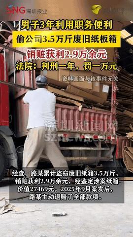 “这是监守自盗!”浙江嘉兴,男子在公司仓库干管理员,为了赚外快,他在3年的时间内,偷偷将公司35000斤的废旧纸箱变卖,获利29000元。然而,此事被公司发现后报警,男子最终因成立盗窃罪获刑。网友:“贪小便宜吃大亏!” 上班挣工资,下班搞点“外快”补贴家用,相信不少打工人可能都有过类似想法,尤其是面对公司里堆着的一些废旧物品,总觉得这是没人要的垃圾,即便拿出去卖了,对公司来说也不算啥。 的确,在浙江平湖一家公司仓库当管理员的路某就是这么想的,他也真的这么做了。可到头来,路某却被判了刑,这到底是怎么回事呢? 路某在公司主要管着仓库,每天和货物、纸箱打交道。 2022年4月的一天,他看着车间里待处理的废旧纸箱,心里打起了小算盘:“这玩意儿肯定公司不会要了,扔了也怪可惜的,不如悄悄藏起来卖掉赚点零花钱,谁又能发现呢?” 这第一次的“顺手牵羊”没被察觉,让他一发不可收拾,此后三年多里,他频频利用职务便利,趁没人注意就藏匿废旧纸箱,再联系他人运到上海变卖。 可终究纸包不住火。2025年9月,公司盘点资产时发现废旧纸箱莫名减少,顺着线索很快查到路某,遂报了警。 很快,路某被警方抓获。 经核实,他在三年多的时间内,累计偷走了约3.5万斤纸箱,销赃获利2.9万余元,而这些纸箱的实际价值经鉴定仅有2.7万余元。 案件在移交到检察院后,检方认为路某的行为构成盗窃罪,向法院提起了公诉。 可能有人不理解,这些都是废旧纸箱而已,又没有什么实际价值,路某拿去卖钱,怎么就构成犯罪了呢? 在这里,要纠正大家一个误区: 第一,公司废品也属公司财产。不管是废旧纸箱、边角料,还是旧设备,只要所有权属于公司,哪怕看似“没用了”,处置权也在公司手里。 个人没经公司同意而私自拿走变卖,本质就是“偷”,只要金额达标就构成盗窃罪。 第二,盗窃数额要看物品实际价值。盗窃罪的定罪数额,不是看行为人销赃获利多少,而是看财物本身的实际价值。 路某卖了2.9万元,但按纸箱鉴定价值为2.7万余元,而我国法律规定,盗窃1000元至3000元以上就属“数额较大”。 可见,路某的盗窃数额已达到立案标准。 因路某在事发后留在原地等待公安机关的到来,系自首。此外,他还有积极退赔、认罪认罚等情节,在具体量刑上应给予从宽处理。 最终,法院综合全案,以盗窃罪判决路某有期徒刑1年,缓刑1年6个月,并处罚金10000元。 路某原本有稳定工作,却因一时贪念,把占公司便宜当成发财路,最后,不仅赚的钱全退回,还留下刑事案底,实在得不偿失。 常言道,君子爱财,取之有道!不属于自己的东西,哪怕再不值钱也不能碰。要知道,一时的侥幸,可能换来的是一辈子的遗憾。 对此,你怎么看呢?欢迎大家在评论区留言。