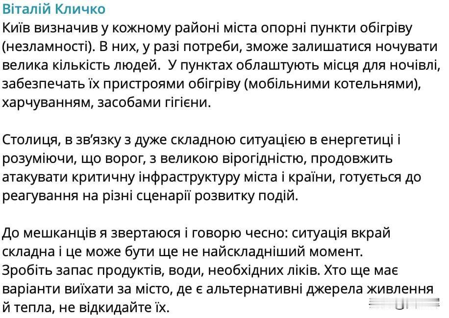 【基辅市长克利奇科再次呼吁有条件的人离开】“我向居民们坦诚呼吁:当前局势极其严峻,且可能还不是最困难的时刻。请储备好食物、水和必需的药品。对于那些有条件前往拥有替代电力与供暖资源的城外地区的人,不应放弃这一选择。”