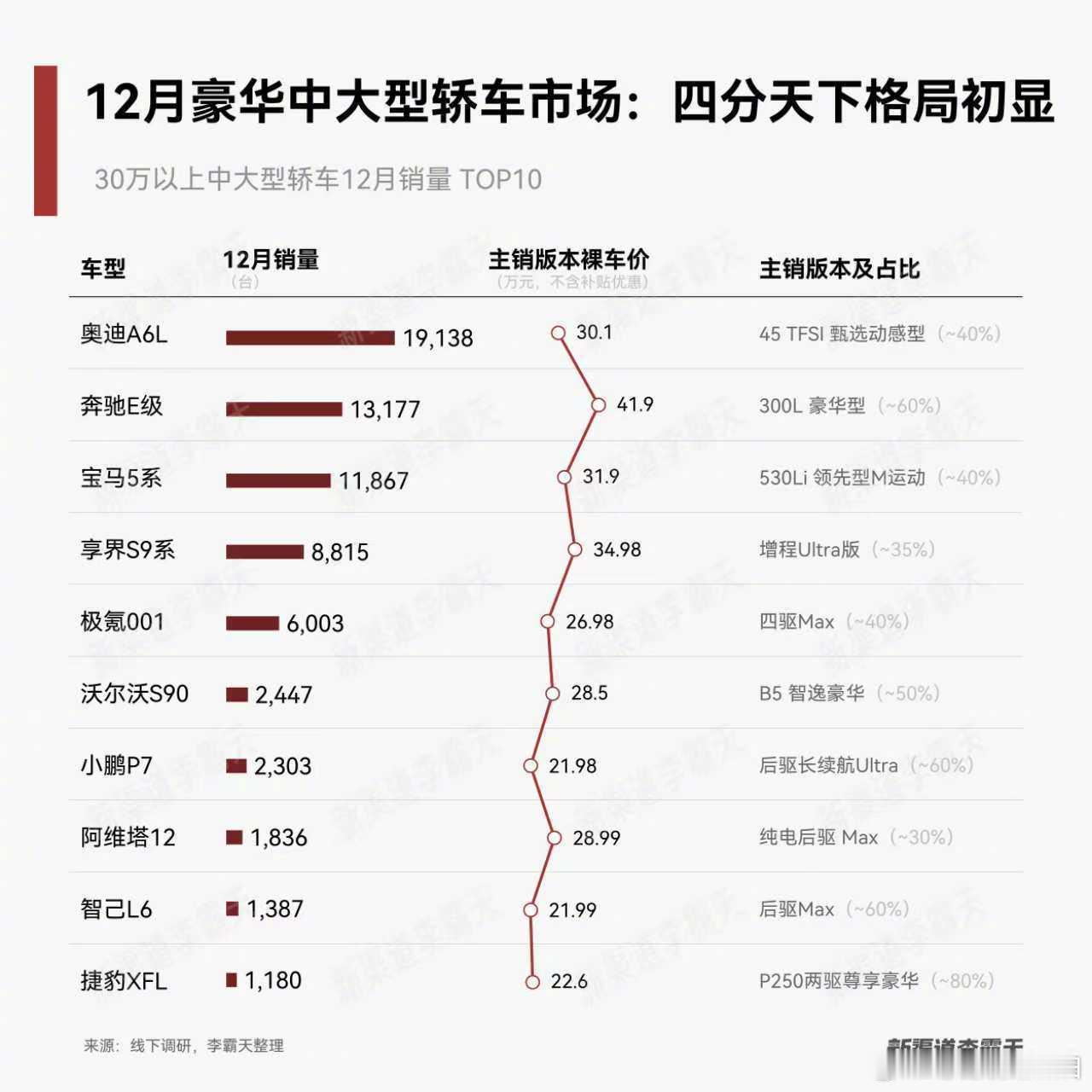 享界量价齐飞突破豪华轿车核心区享界 S9 系列在 12 月卖了 8,815 台,这是品牌车系的新纪录。在鸿蒙的定位体系里面,享界的任务就是对标 BBA。还有个更加细分的数据,S9T 的销量是 7,186 台,享界只剩一千多台了。蔚来 ET5 也是这样的情况,ET5T 卖得比 ET5 更好。在定价一致或者接近的情况下,消费者已经更加愿意买两厢旅行车了。新能源汽车大v聊车