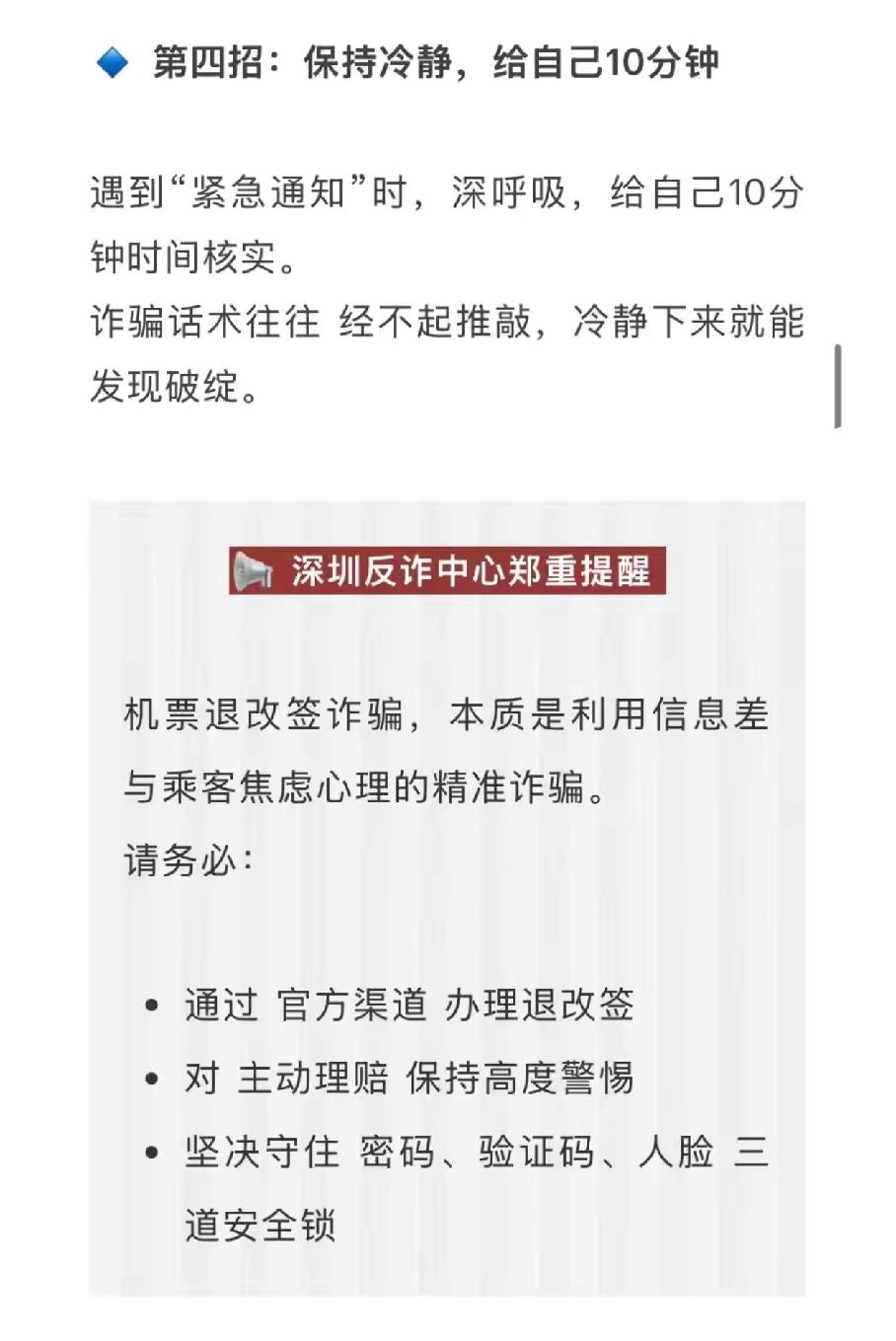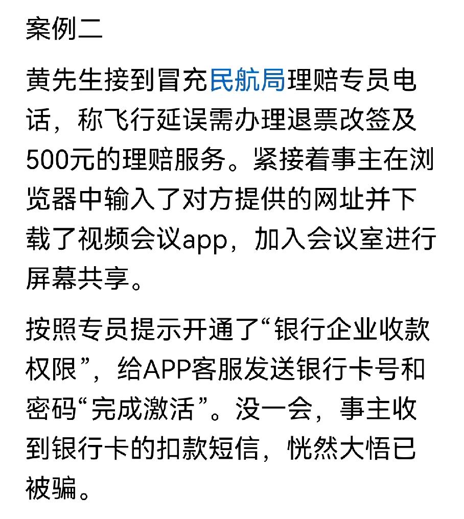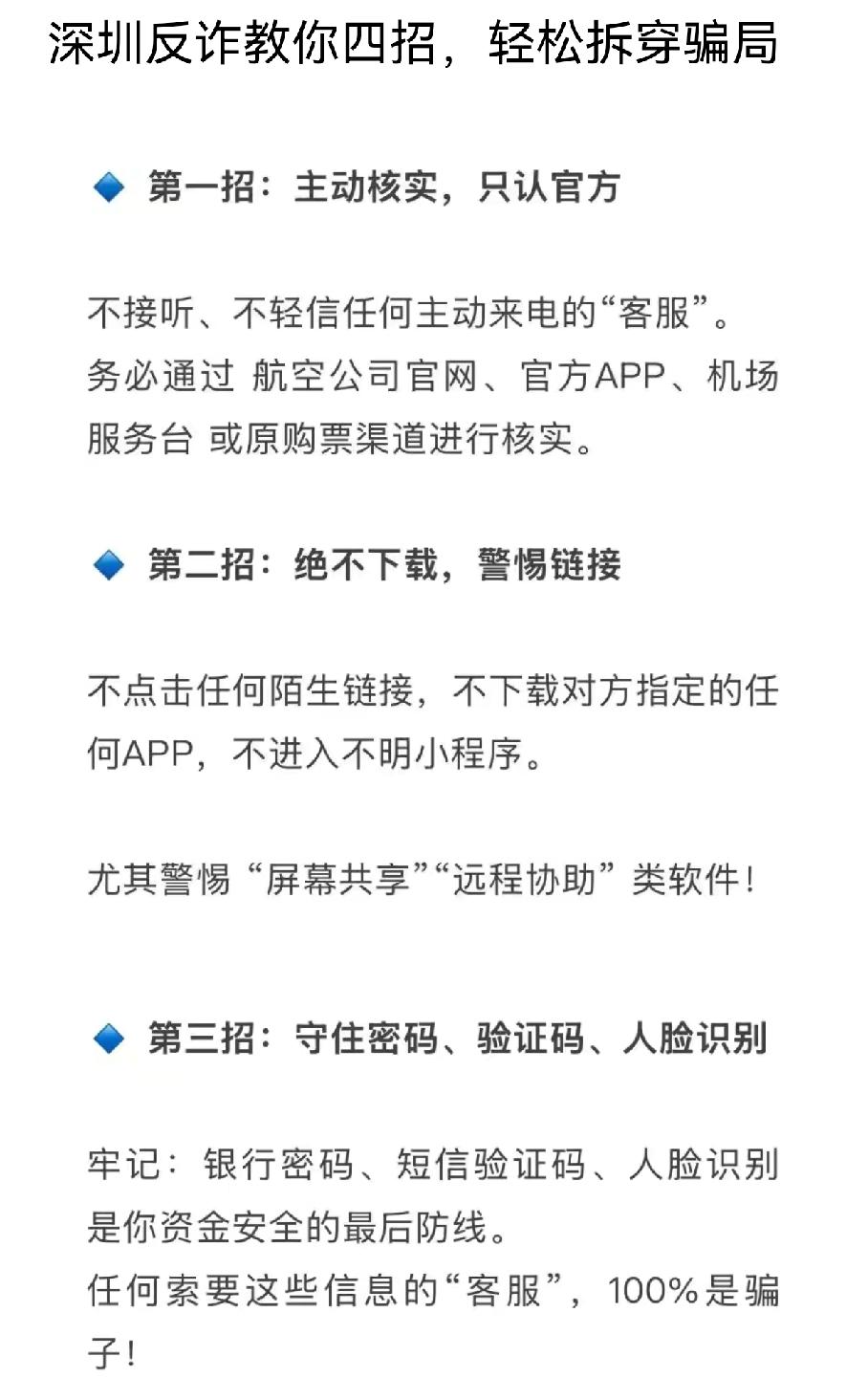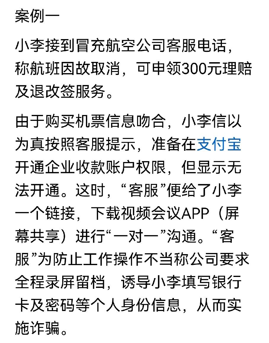 重要提醒!骗子年底又在冲“业绩”!据媒体报道,临近春节,航班“客服”退改签诈骗已发生多起,提醒大家遇事一定要冷静,不要急于在手机上进行操作。对突然收到航班“客服”电话 说需要改签,务必通过官方渠道进行核实。春节临近,航班退改签诈骗进入高发期,骗子冒充航司客服,凭非法获取的航班信息博取信任,以航班取消、延误需理赔改签设套。牢记以下要点,守住钱袋子: 1. 遇行程变动通知,务必通过航司官方APP、官网或正规客服热线核实,勿信陌生来电短信; 2. 不点陌生链接、不下载未知APP,拒绝对方屏幕共享的要求; 3. 验证码、银行卡密码是财产最后防线,绝不向任何人透露; 4. 察觉异常立即挂断,拨打96110反诈预警热线,被骗速报110。 谨记不轻信、不透露、不转账,平安出行迎新春。请将该信息转发给你的亲朋好友,共同守护出行之路安全。社会热点 乘航班谨防“退改签诈骗”
