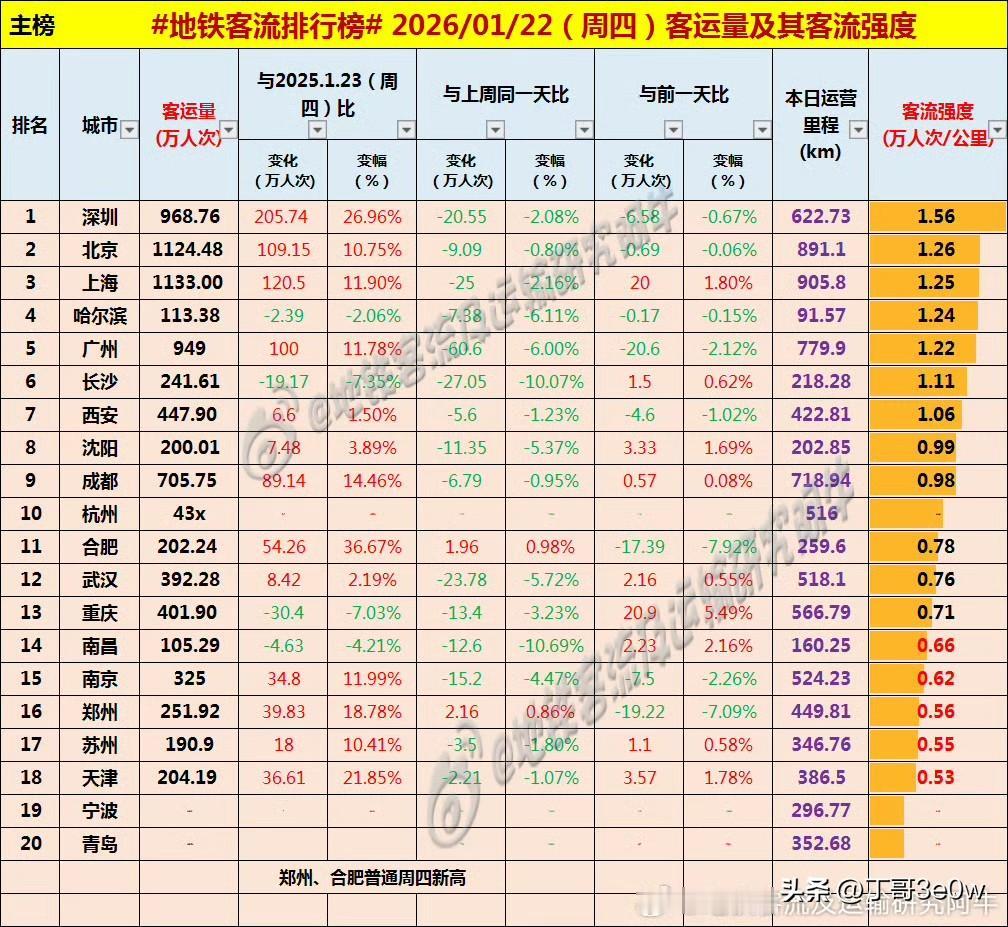 寒流过后,上海地铁客流量昨日达1133万人次重返排行榜榜首[呲牙][呲牙][呲牙] 爆料 身边事 中国地铁客流日报 地铁客流排行榜 昨日客流 周四 上海 2026年1月22日 星期④ 全国重点城市轨道交通客流量排行榜: 上海:1133.00万 北京:1124.48万北京身边事 深圳:968.76万 广州:949.00万广州地铁 成都:705.75万 西安:447.90万西安身边事 杭州:431.00万杭州爆料 重庆:401.90万重庆身边事 武汉:392.28万武汉爆料 南京:325.00万南京地铁 郑州:251.92万 长沙:241.61万 天津:204.19万天津身边事 合肥:202.24万合肥地铁 沈阳:200.01万 苏州:190.90万苏州地铁 青岛:113万+ 宁波:113万+宁波身边事 哈尔滨113.38万哈尔滨爆料 南昌:105.29万