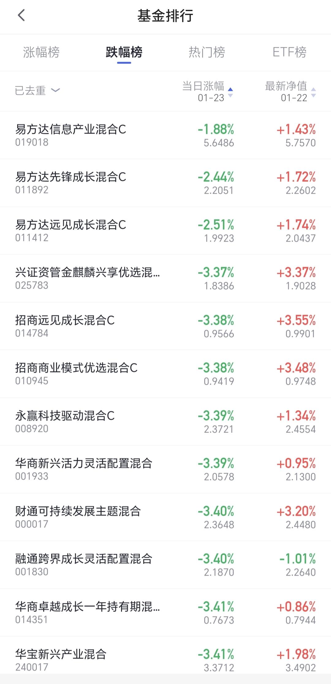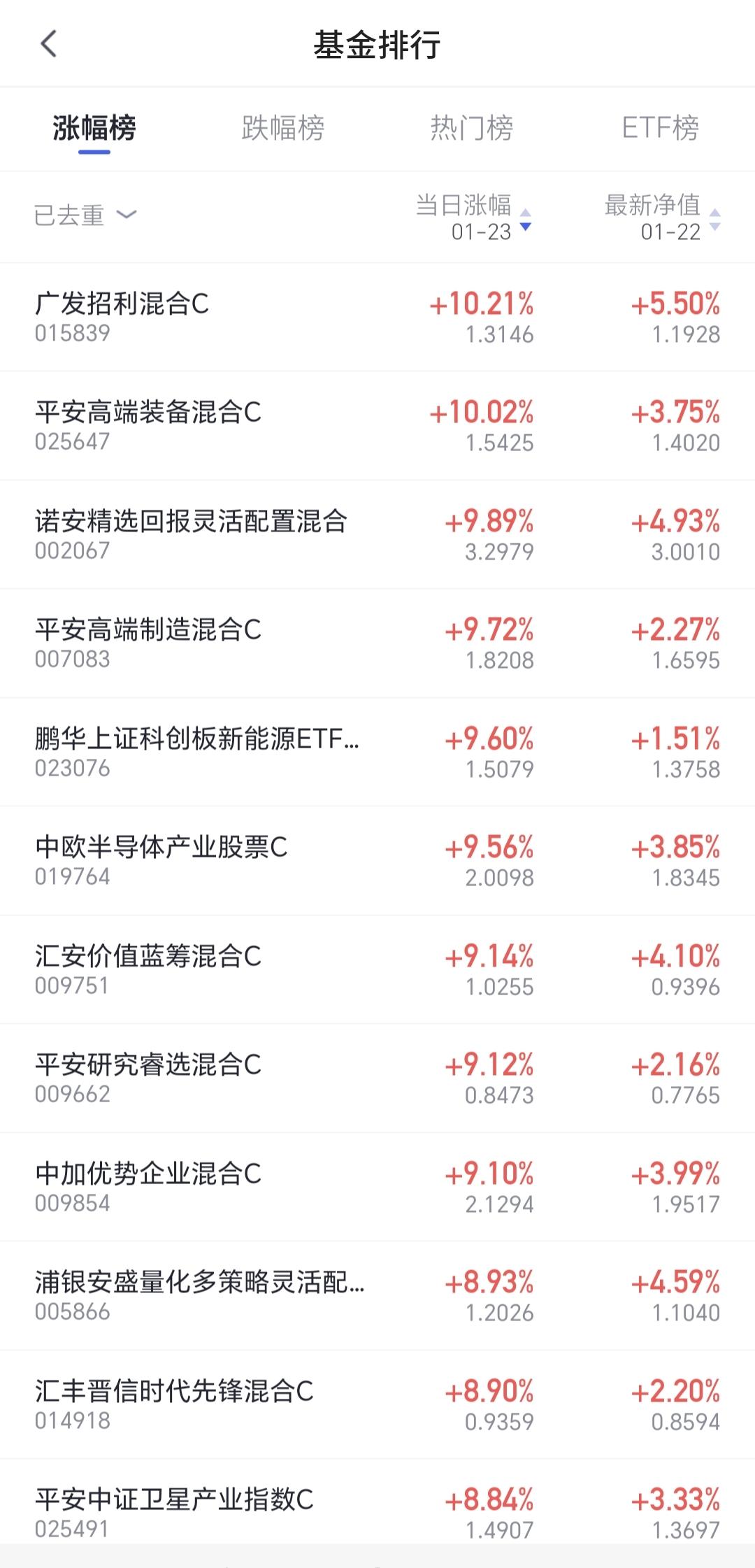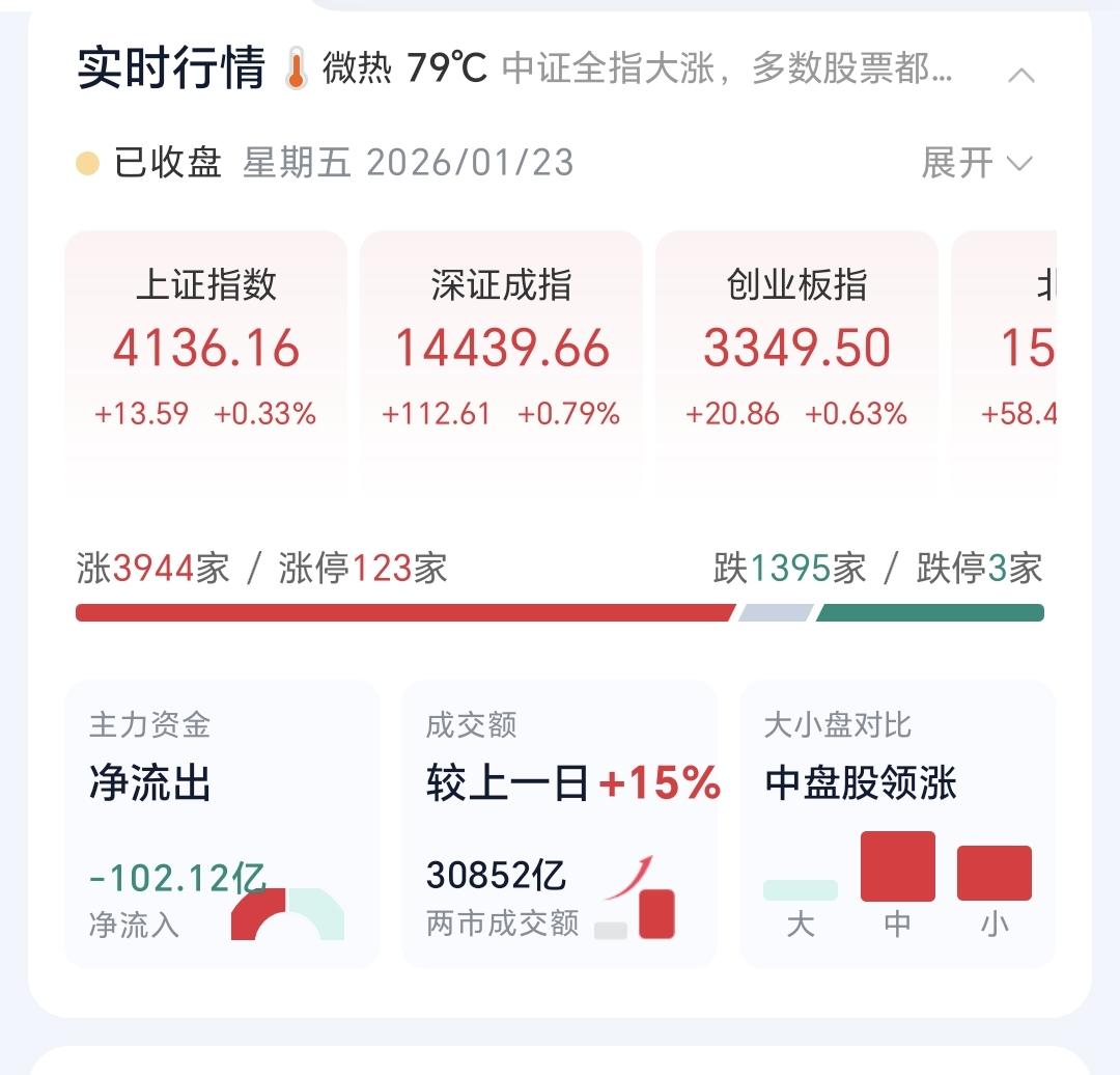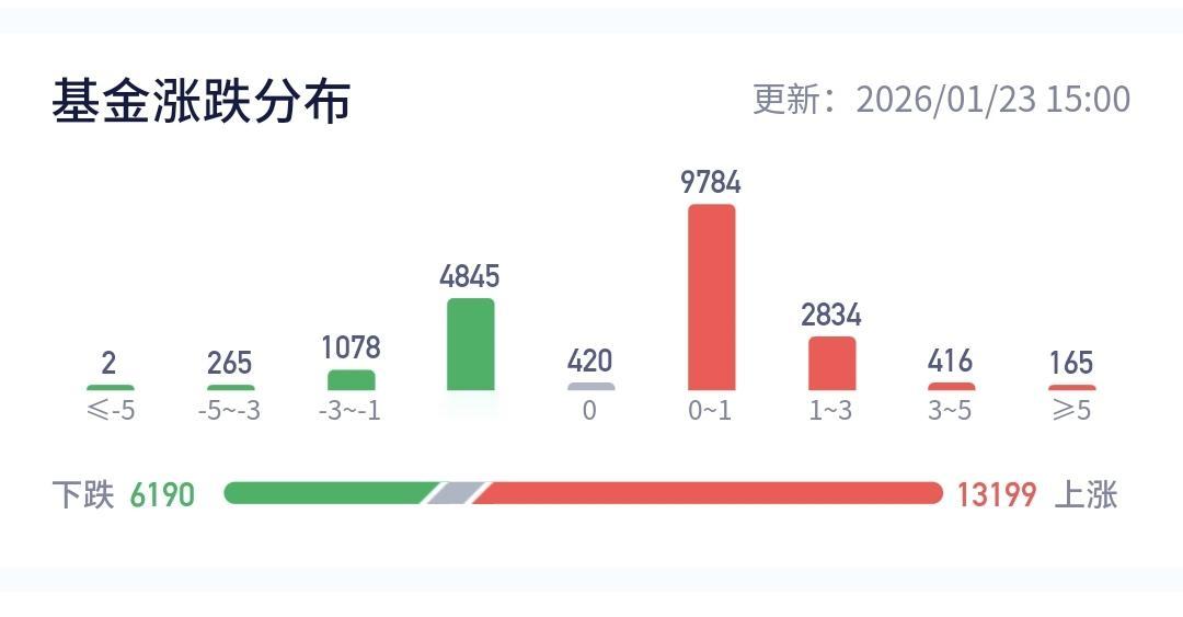 基金:市场的大高点什么时候到来 市场今天就是一个震荡走势,盘中最高4143点,盘中最低4120点,上下只有23个点的幅度,收盘的时候三大指数都是小涨,创业板指上涨了0.63%,收于3349点,上证指数上涨了0.33%,收于4136点。 整个股票市场,上涨3944家,下跌1395家,涨停123家,跌停3家,上涨家数多于下跌家数,涨停家数超过了100家。 今天两市累计成交30852亿,相比于昨天放量了15%,内资净流出266亿。 持有的基金中,下午收盘的时候,估值上涨幅度最大的三个板块是:新能源汽车板块。可控核聚变板块,AI应用板块,估值下跌幅度最大的三个板块是:5G板块,芯片半导体板块,兴全合宜,估值整体亏损了817元。 整个基金市场,上涨13199家,下跌6190家,上涨幅度超过5%的165家,下跌幅度超过5%的2家。 图9是今天基金的上涨排行榜,图10是今天基金的下跌排行榜,图11是ETF上涨幅度排行榜,图12是今天基金的加仓榜,图13是今天基金的减仓榜。 1:今天市场成交量又达到了3万亿以上,3万亿以上的成交量,才有可能再一次冲击前高,到时候观察冲击前高时候的成交量,是再放天亮还是大幅度低于前量。 2:春节之前还有15个交易日,这段时间大起大落的可能性不大,我估计收盘点位就在4000至4100点之间,如果收盘点位在4200点附近,到时候有可能会进行再一次止盈。 3:市场挣钱是少部分人,市场亏钱是大部分人,当市场里面大部分人挣钱的时候,距离调整也就不远了,大部分人挣钱时段持续的越长,这个高点的级别就越大,如果你自认为已经成为股神的时候,市场距离大的调整已经不远了,这也是为什么有许多人晒收益的时候,也就是到了市场高点的时候,现在还没有看到这些情况,即使有高点也不会是大级别的高点。 今年挣钱的基民占92%,亏损的居民基8%,见下面的截图14,90%以上的基民挣钱,持续的时间越长,高点到来的时间就越近,高点的级别也就越大。 大家帮忙评论,点赞,分享和转发,谢谢大家的支持,没有规定一个人只能评论一条,有时间的朋友可以帮忙多评论几条。