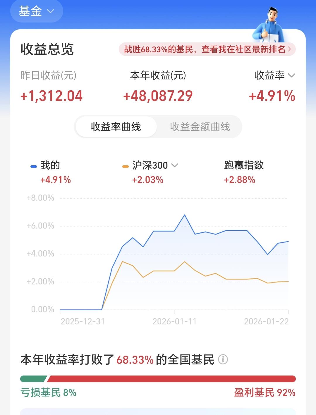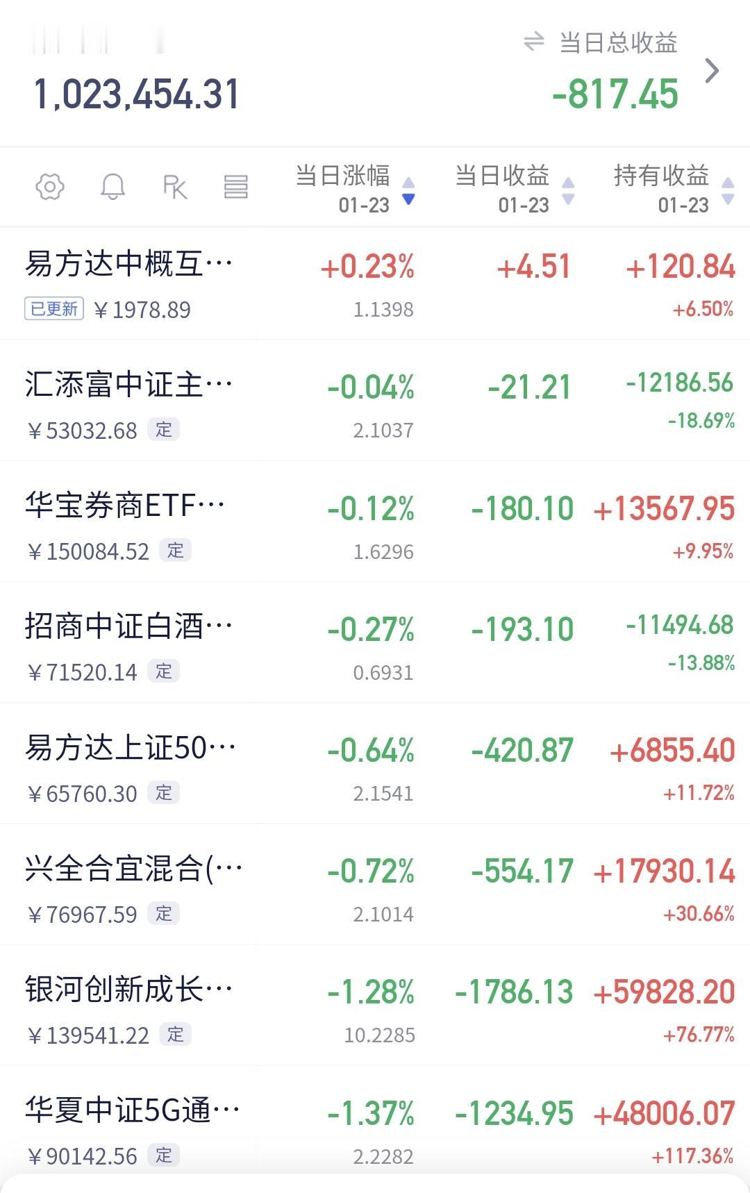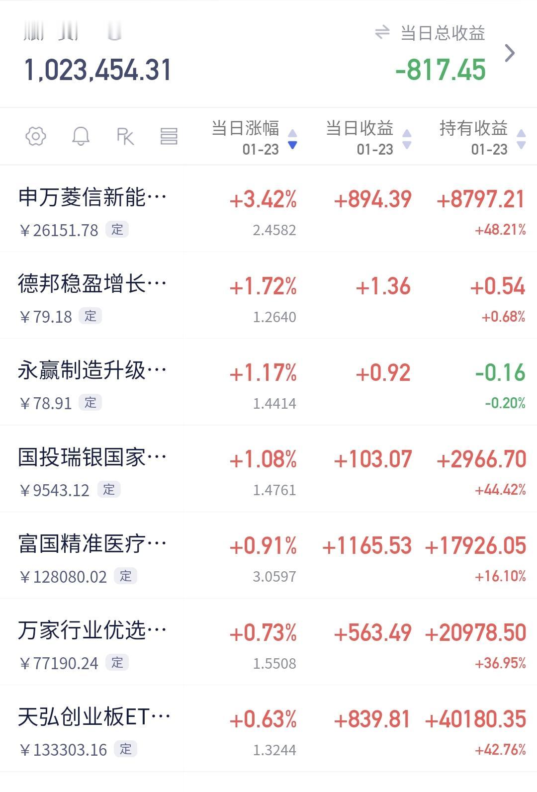 基金:市场的大高点什么时候到来 市场今天就是一个震荡走势,盘中最高4143点,盘中最低4120点,上下只有23个点的幅度,收盘的时候三大指数都是小涨,创业板指上涨了0.63%,收于3349点,上证指数上涨了0.33%,收于4136点。 整个股票市场,上涨3944家,下跌1395家,涨停123家,跌停3家,上涨家数多于下跌家数,涨停家数超过了100家。 今天两市累计成交30852亿,相比于昨天放量了15%,内资净流出266亿。 持有的基金中,下午收盘的时候,估值上涨幅度最大的三个板块是:新能源汽车板块。可控核聚变板块,AI应用板块,估值下跌幅度最大的三个板块是:5G板块,芯片半导体板块,兴全合宜,估值整体亏损了817元。 整个基金市场,上涨13199家,下跌6190家,上涨幅度超过5%的165家,下跌幅度超过5%的2家。 图9是今天基金的上涨排行榜,图10是今天基金的下跌排行榜,图11是ETF上涨幅度排行榜,图12是今天基金的加仓榜,图13是今天基金的减仓榜。 1:今天市场成交量又达到了3万亿以上,3万亿以上的成交量,才有可能再一次冲击前高,到时候观察冲击前高时候的成交量,是再放天亮还是大幅度低于前量。 2:春节之前还有15个交易日,这段时间大起大落的可能性不大,我估计收盘点位就在4000至4100点之间,如果收盘点位在4200点附近,到时候有可能会进行再一次止盈。 3:市场挣钱是少部分人,市场亏钱是大部分人,当市场里面大部分人挣钱的时候,距离调整也就不远了,大部分人挣钱时段持续的越长,这个高点的级别就越大,如果你自认为已经成为股神的时候,市场距离大的调整已经不远了,这也是为什么有许多人晒收益的时候,也就是到了市场高点的时候,现在还没有看到这些情况,即使有高点也不会是大级别的高点。 今年挣钱的基民占92%,亏损的居民基8%,见下面的截图14,90%以上的基民挣钱,持续的时间越长,高点到来的时间就越近,高点的级别也就越大。 大家帮忙评论,点赞,分享和转发,谢谢大家的支持,没有规定一个人只能评论一条,有时间的朋友可以帮忙多评论几条。