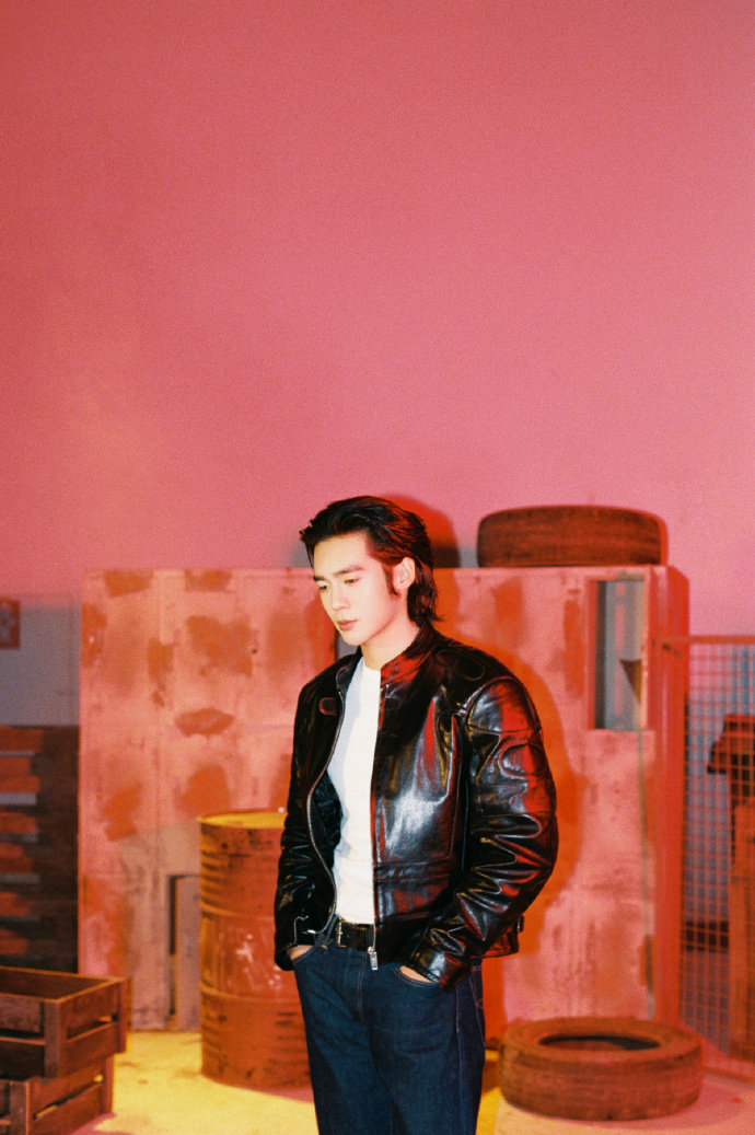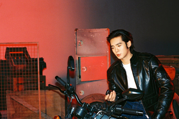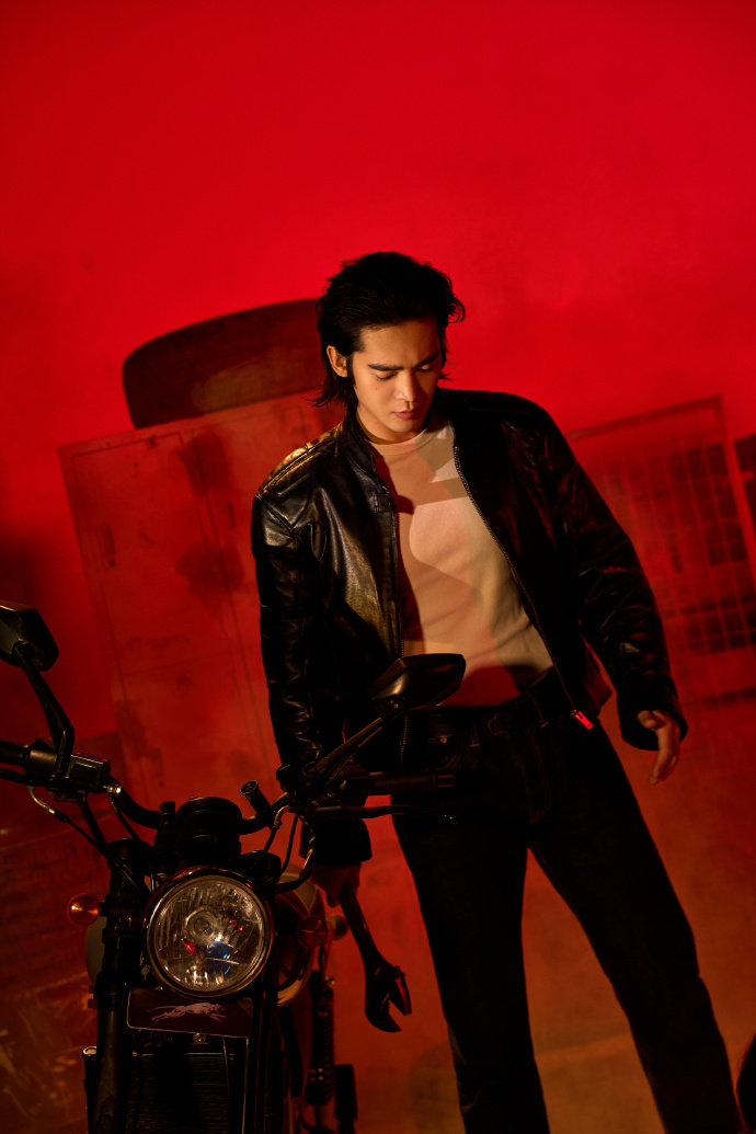 于适机车风衣于适黑色皮衣写真赤光笼罩之下,行随影动,锋芒暗涌。杀青快乐~于适