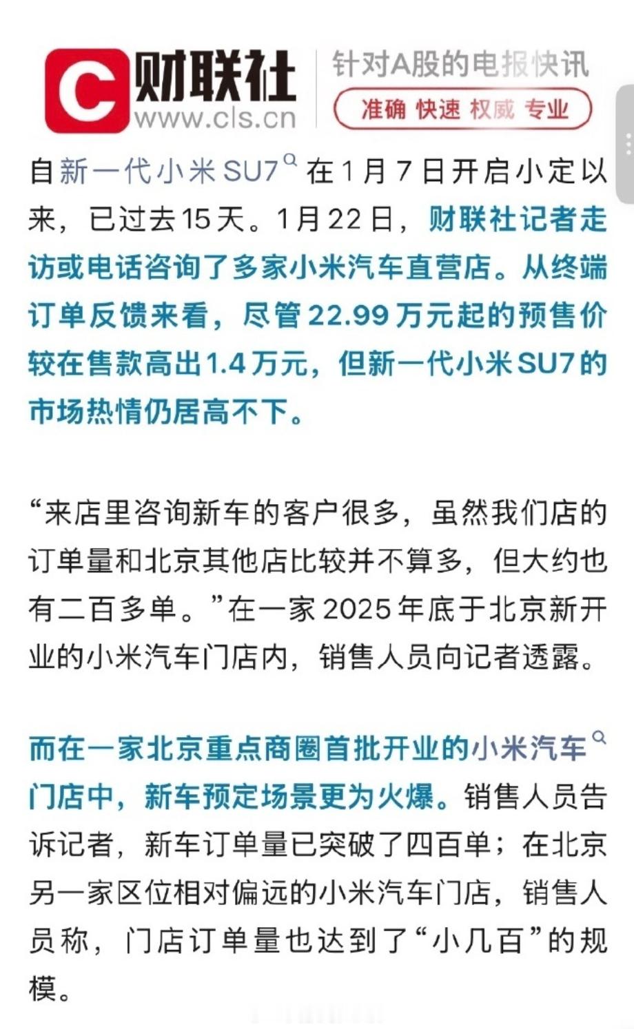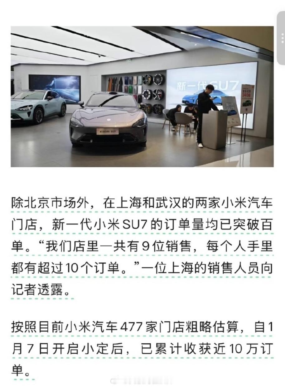 按照目前小米汽车477家门店粗略估算,自1月7日开启小定后,新一代小米SU7已累计收获近10万订单新款同样提供标准、Pro、Max三个版本,预售价22.99万元、25.99万元、30.99万元,相比现款在售车型,起售价上涨1.4万元。新一代小米SU7预售半月订单近10万新一代小米SU7新能源汽车