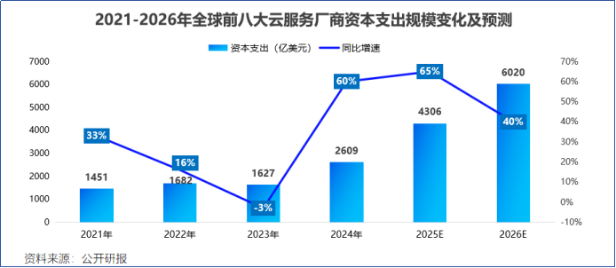 全球前八大云服务厂商,2025年资本支出合计在4306亿美元,同比增长65%,预计2026年仍能保持40%的高位增速。