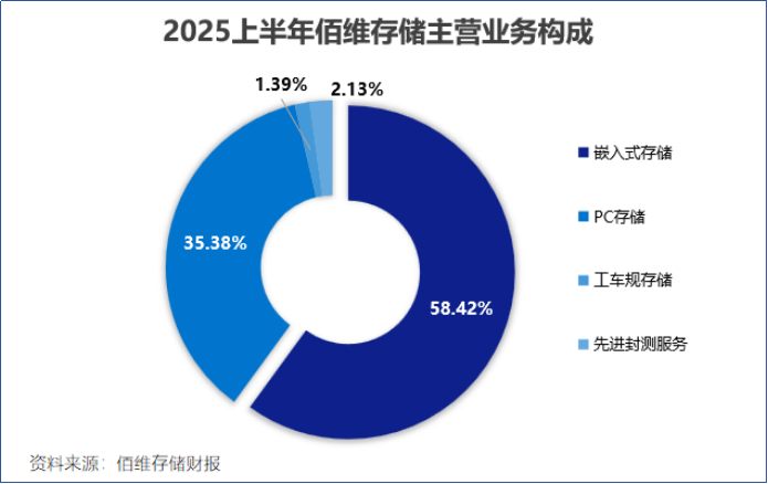 2025上半年,公司存储产品带来收入37.24亿,嵌入式存储营收占比达到58.42%。此外,封测服务近两年也有不小增长,同期实现0.83亿营收。
