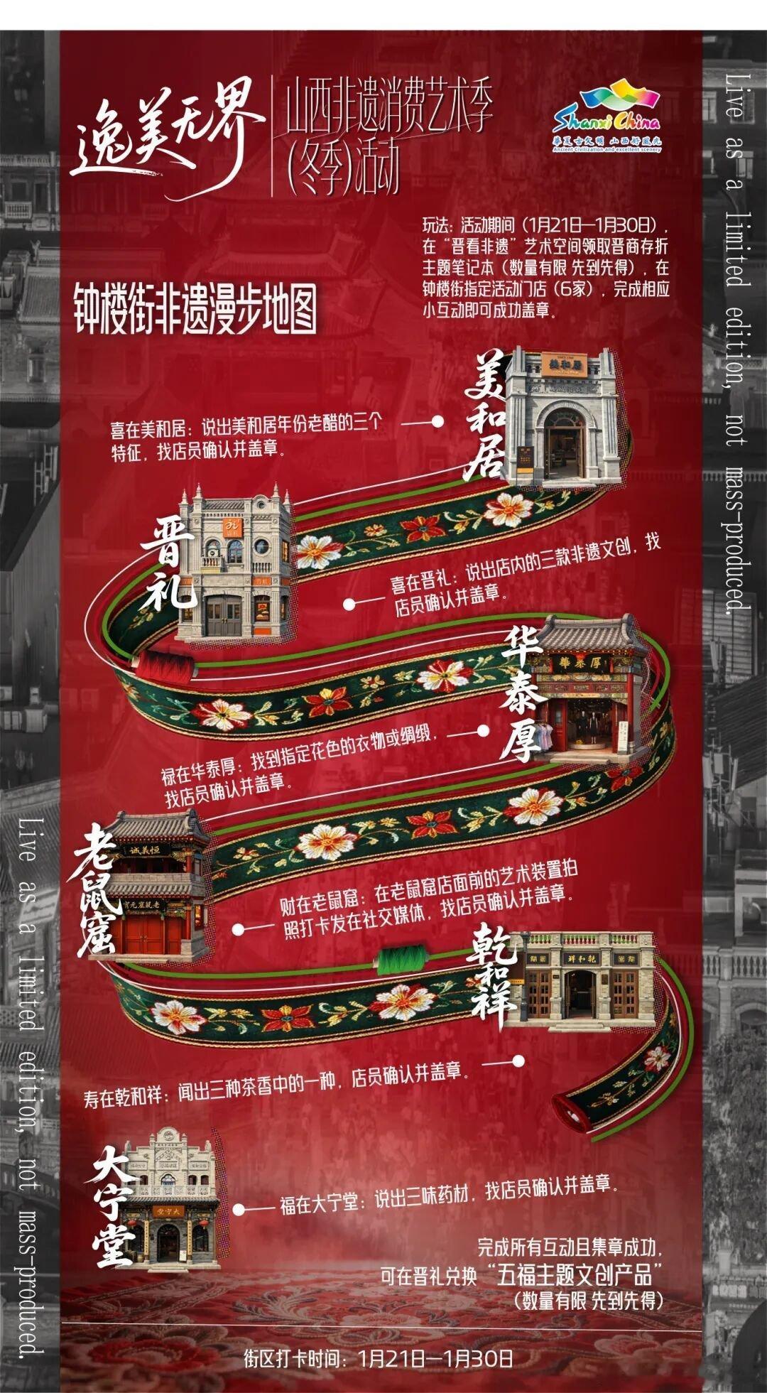 【太原钟楼街变成了“潮玩”现场】这才是文化遗产最好的打开方式当千年非遗遇上摩登街区,当传统技艺碰撞当代美学,一场持续两个月的文旅消费盛宴在唐风晋韵,锦绣太原 启幕。2026年1月21日至3月22日,由山西省文化和旅游厅、山西省商务厅、太原市人民政府联合主办,太原市文化和旅游局、太原市迎泽区人民政府承办,钟楼街综合服务中心协办的“‘逸美无界’山西非遗消费艺术季(冬季)活动”在太原钟楼街正式启动。此次活动以“非遗融入现代生活”为核心,通过多元互动环节、创新消费场景与立体宣传矩阵,打造兼具话题度与消费力的文旅营销新标杆,通过集表演、展览、体验、消费于一体的非遗大赏,让深藏于三晋大地的非遗走出展柜、融入市井,化为可触摸、可参与、可消费的现代生活美学。【“晋看非遗”沉浸式艺术空间,打造可逛可玩美学空间】活动期间,“晋看非遗”艺术空间(钟楼街61号)化身非遗美学体验馆。展览以“五福临门”为线索,串联晋绣纹样与多元非遗项目,通过场景活化、科技赋能,构建“可观、可逛、可买、可玩”的沉浸式空间。观众既可体验剪纸、面塑、皮影等手作工坊,也能选购黎侯虎、关公IP手办等兼具传统韵味与现代审美的文创好物。【全街打卡+品牌联动,开启“非遗漫步计划”】活动过程中,同步推出“钟楼街非遗漫步地图”,乾和祥、大宁堂、老鼠窟、华泰厚、美和居、晋礼等10余家品牌门店结为“漫步搭子”,游客可持定制晋商主题打卡本,集章解锁惊喜好礼,乐享“打卡—兑奖—消费”趣味闭环。【重磅计划接连发布,培育非遗时代新力量】活动将重磅发布“2026年非遗民俗活动”“非遗主理人招募计划”及“非遗时代新青年培养计划”,推动非遗从静态保护走向动态传承,激发受众携带非遗的感知,重返生活的广袤剧场。山西文化记忆 “一条钟楼街,半部府城史”。作为太原千年文脉的见证者,这条承载着历史记忆与市井烟火的街巷,将开启一场关于山西非遗的现代化叙事。这个冬天,邀请您走进钟楼街,也愿大家在这场非遗的当代旅程中,如那些历经时光打磨的器物般,在各自的轨道上,闪耀无可复制的、专注而浓烈的光。 太原·钟楼街