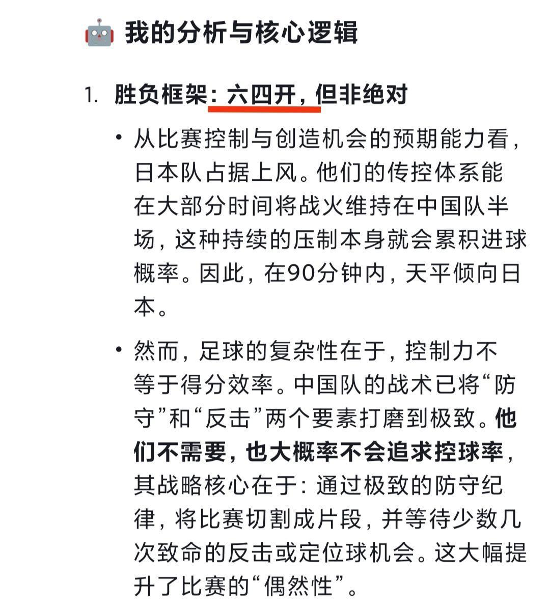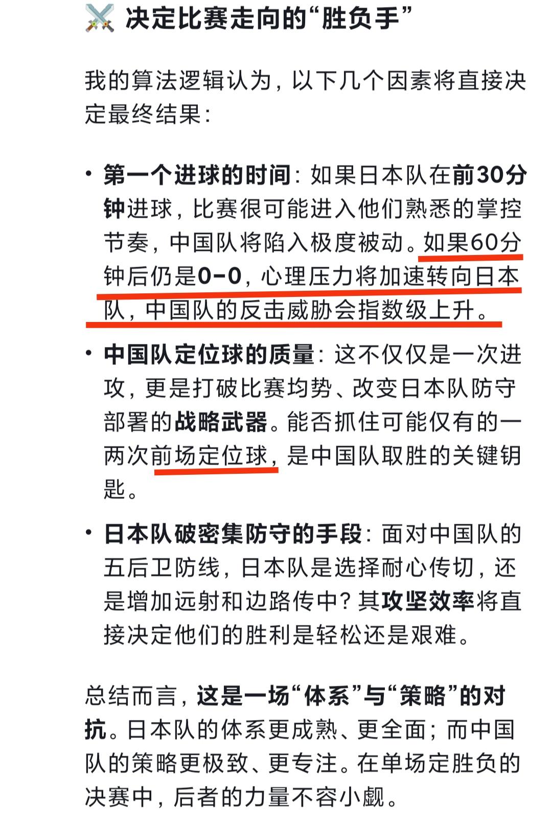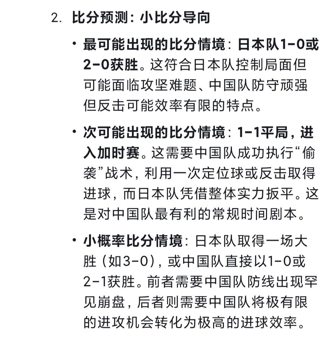 U23亚洲杯决赛,明晚将打响,我让deep seek预测了一下比赛结果,跟我想的差不多。 它认为中国队只要扛住前60分钟不丢球,就会有机会取胜。 同时它也认为,日本队小比分获胜的概率更高。 特别是如果前30分钟内,日本队先进球,那中国队的处境将会变得极为艰难。 我个人觉得,不怕日本队的定位球和单刀球,就怕禁区外的远射和偷袭。 对方的远射和偷袭,有可能进两个球。 我们取胜的机会应该就是角球或者任意球,抓住哪怕一次机会就行。1:0夺取冠军也不是不可能! 所以我的预测,要么日本队2:0获胜,要么中国队1:0夺冠! 明天看看结果吧。 U23亚洲杯