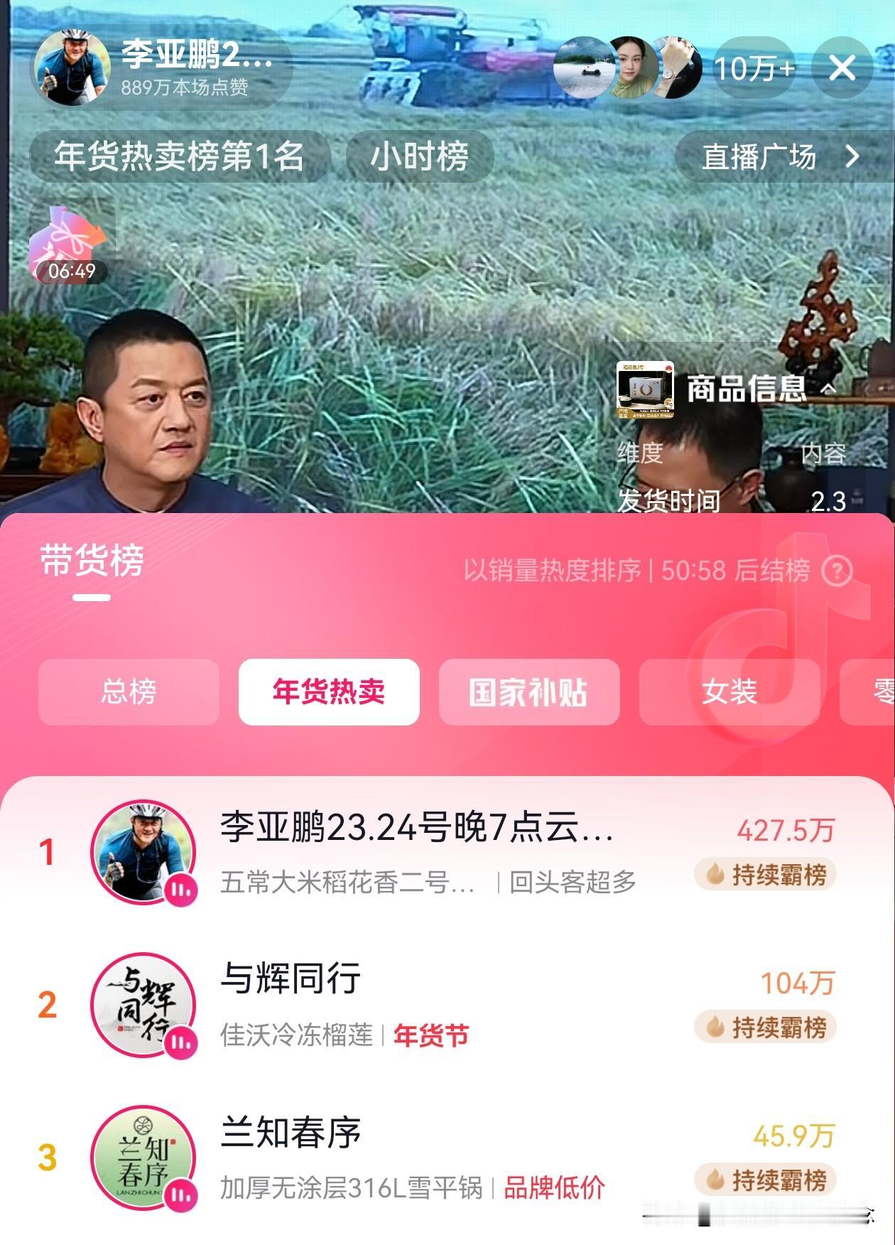今天李亚鹏提前开播, 还不到7点直播间就10万+了, 但是,让人意外的是,他关闭了打赏功能! 开播10分钟,已经跃居年货热卖榜第一名,且遥遥领先。 公屏不断刷新网友的留言,让他别介绍了,直接上链接,还有点让他把礼物打开。 目前李亚鹏的粉丝已经突破900万。大家把对嫣然的爱化为直播间的订单,把曾经对李亚鹏的误解化作此刻的支持。 我相信,善良自带光芒,靠谱的人永远不会被辜负。 李亚鹏