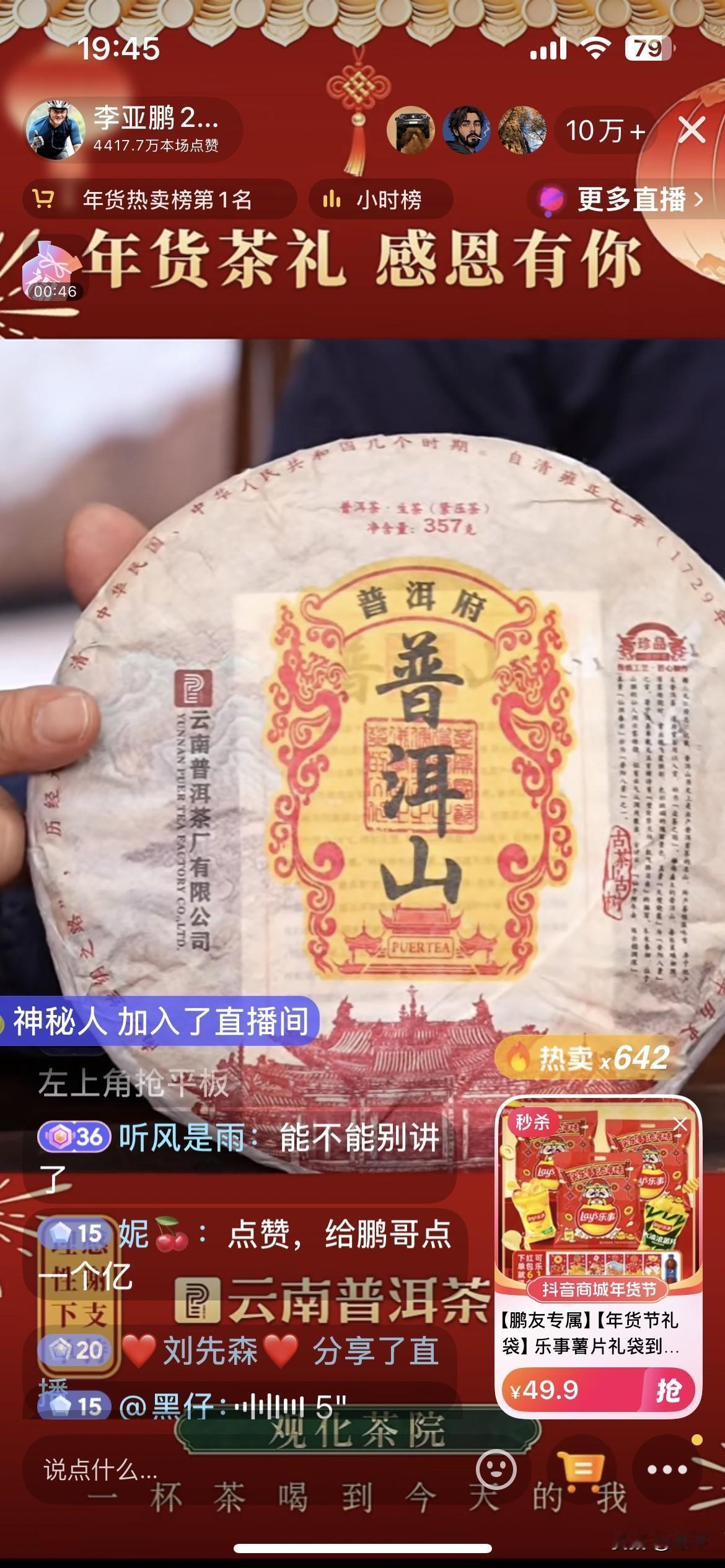 李亚鹏把董宇辉压过去了,带货榜蝉联第一名。 看来咱们中国人还是最讲情怀的,今天我也下了一单茶叶支持一下。