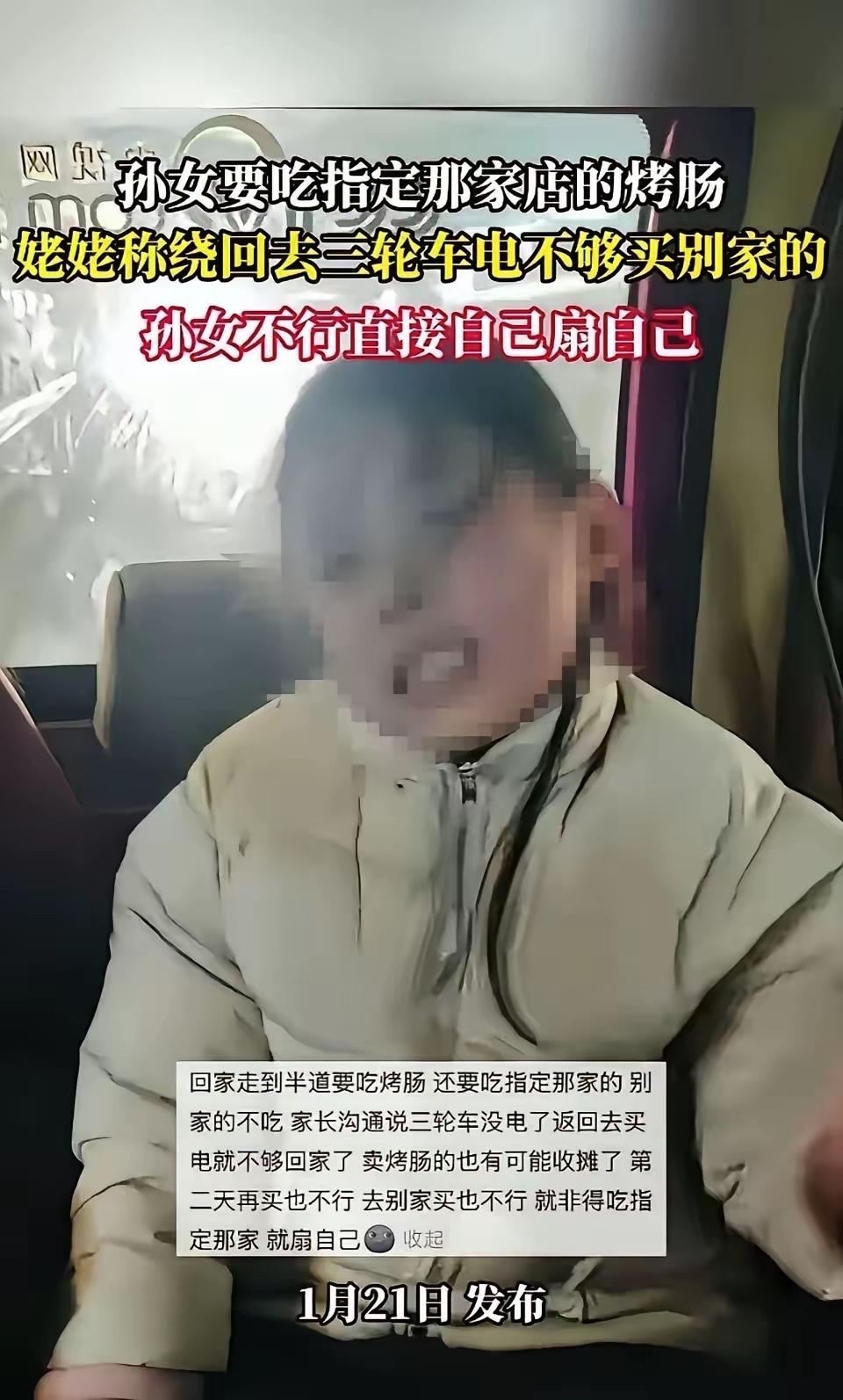 网友发布视频,姥姥接外孙女放学回家,孙女半道上想吃烤肠,还指定必须吃那家的。姥姥说再折返回去买烤肠,电瓶车电就不够回家的。劝说明天给买不行,换一家给买也不行。孙女见姥姥不给买,居然用手扇脸,一直不停扇脸,脸都扇红了,但就是咬着牙继续扇! 有网友表示:家长的问题。明显应该亲自上手,既能达到孩子想挨耳光的诉求,又能表明作为家长的态度。 这事儿说到底,真不是一根烤肠那么简单,这就像房子地基歪了楼盖得再高早晚得塌。对于这种已经学会用自残来控制大人的孩子,最忌讳的就是“心软”和“讲道理”,这时候任何的温和劝阻在她眼里都是软弱的表现。 有些所谓的专家总是把“共情”、“疏导”挂在嘴边,但在这种绝对的控制欲面前,任何温良恭俭让都是在助纣为虐。这就好比你在驯兽,它呲牙的时候你给肉,下次它就能咬断你的脖子。这孩子看似是在伤害自己,实则是在进行最赤裸裸的道德绑架,用肉体痛苦来迫使权力方——也就是长辈,不得不低头。 这就是典型的“惯子如害子”,现在是一根烤肠,长大了那就是房子车子、无底洞一样的索取。你得让她明白,地球不是围着她转的,姥姥的小电驴电瓶也不是核动力,说没电就没电。 对此大家怎么看呢
