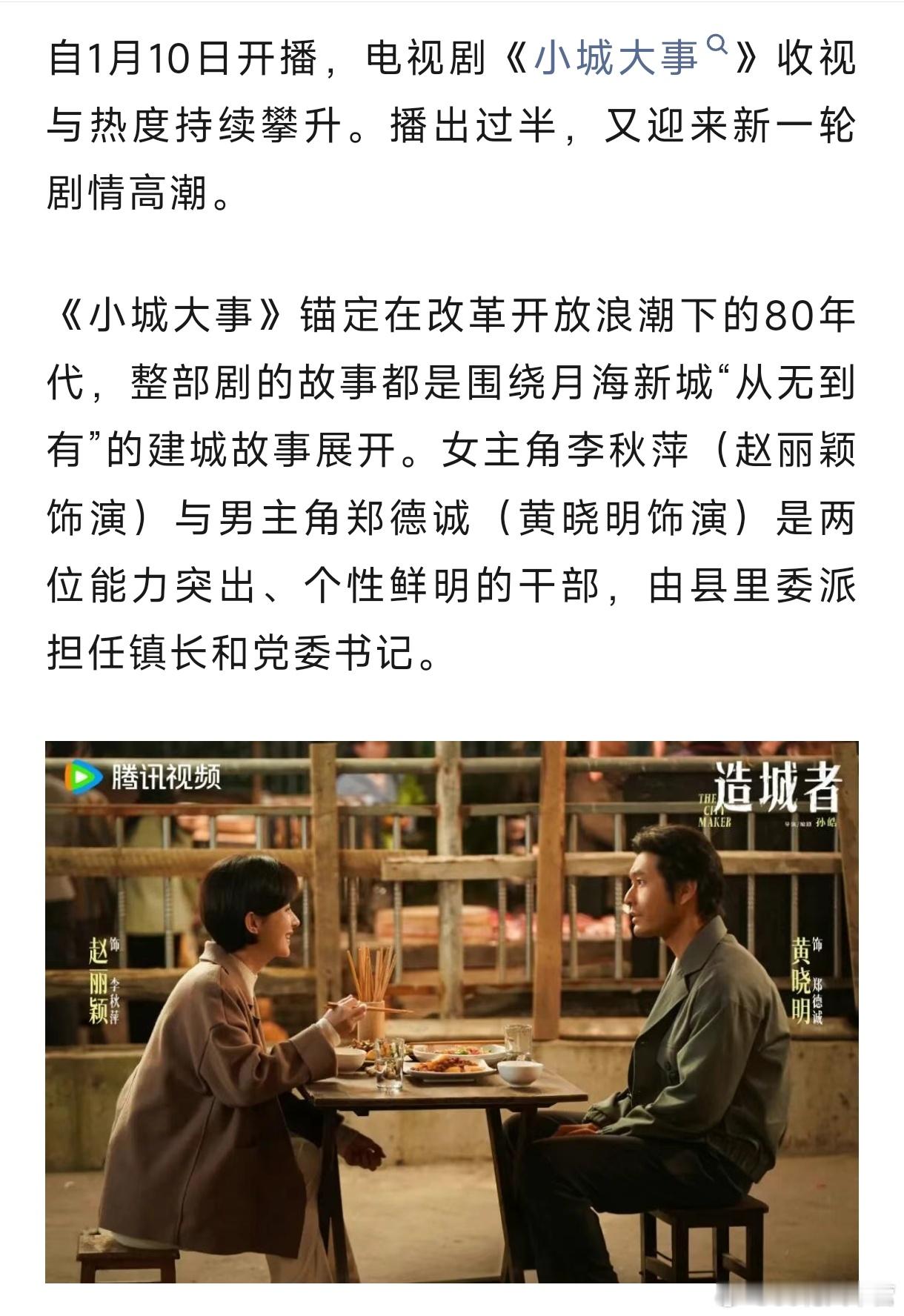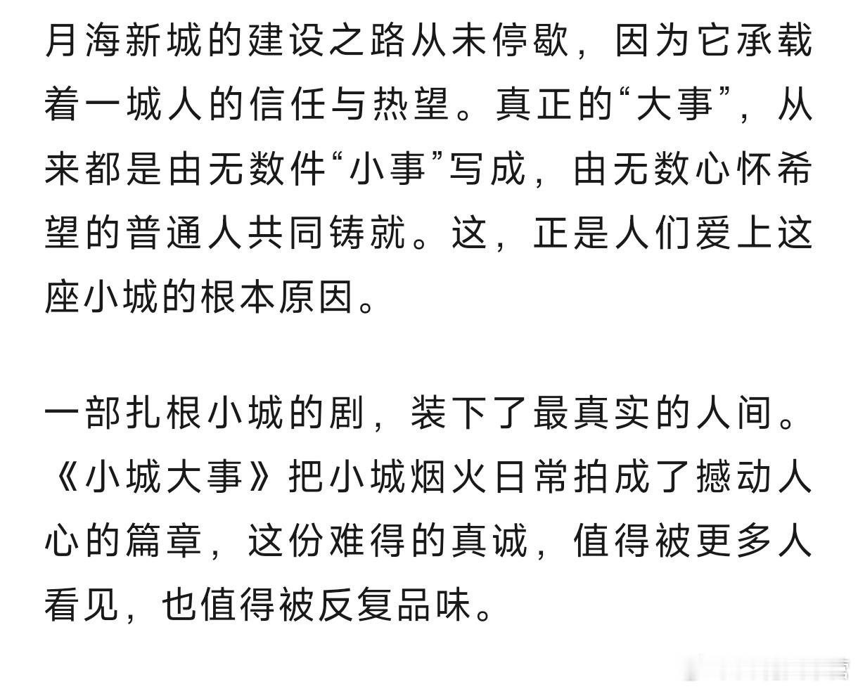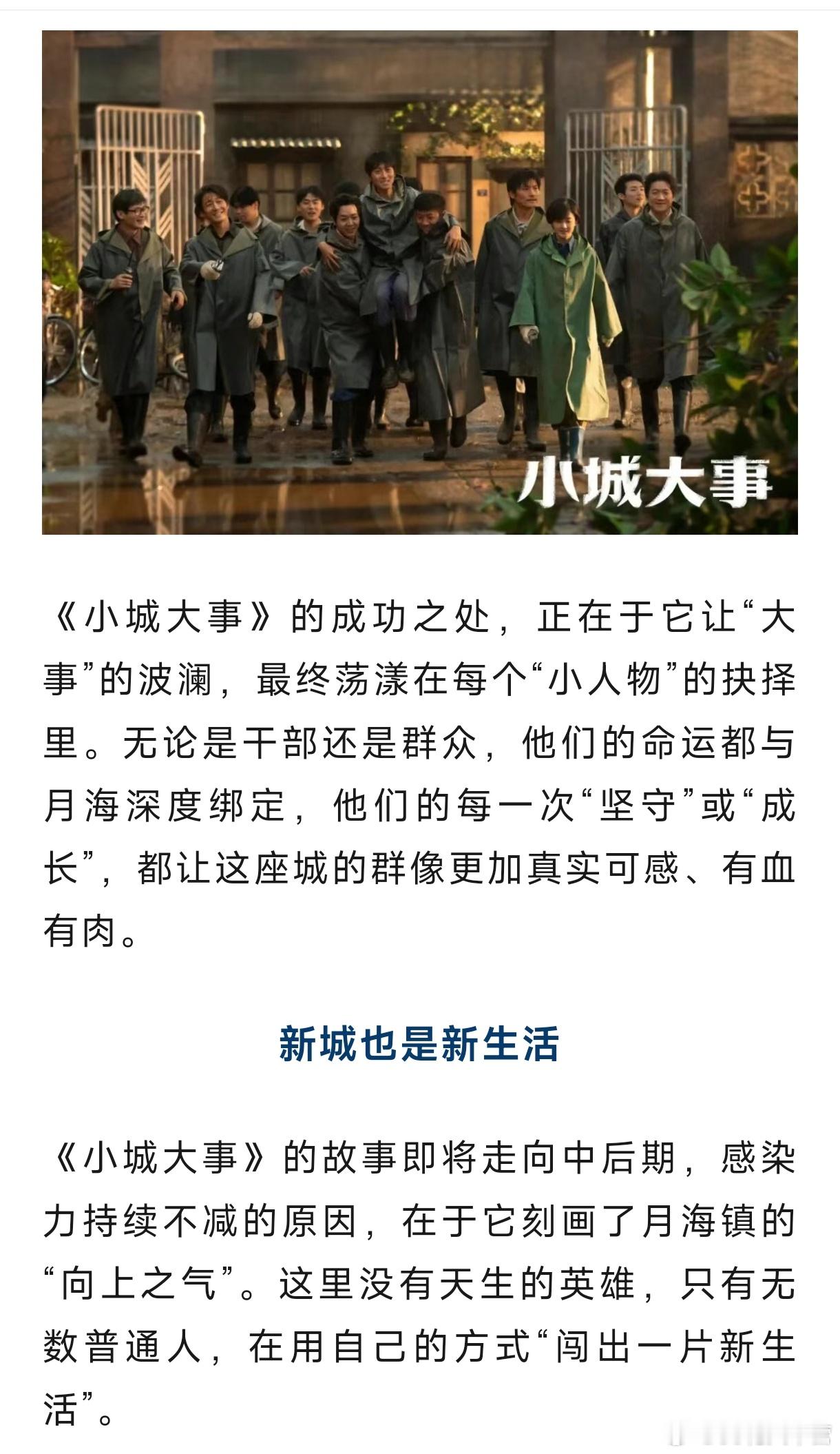 中国新闻周刊——《小城大事》:关关难过关关过,月海全员永不放弃!剧中没有刻意渲染的困难,只聚焦普通人在时代浪潮中的坚守与奋斗,他们建造的不仅是新厂房、新街道,更是有奔头、有希望,且充满互助情谊的新生活。《小城大事》的脱颖而出绝非偶然。它用细腻的群像刻画、扎根现实的叙事,还原了时代的精神;它告诉人们,好的时代热血群像剧不是复刻历史场景,而是让观众感受到那个年代的温度;好的城市叙事不是歌颂高楼大厦,而是记录普通人在城市里的欢笑与泪水、坚守与成长。一部扎根小城的剧,装下了最真实的人间。《小城大事》把小城烟火日常拍成了撼动人心的篇章,这份难得的真诚,值得被更多人看见,也值得被反复品味。小城大事赵丽颖李秋萍