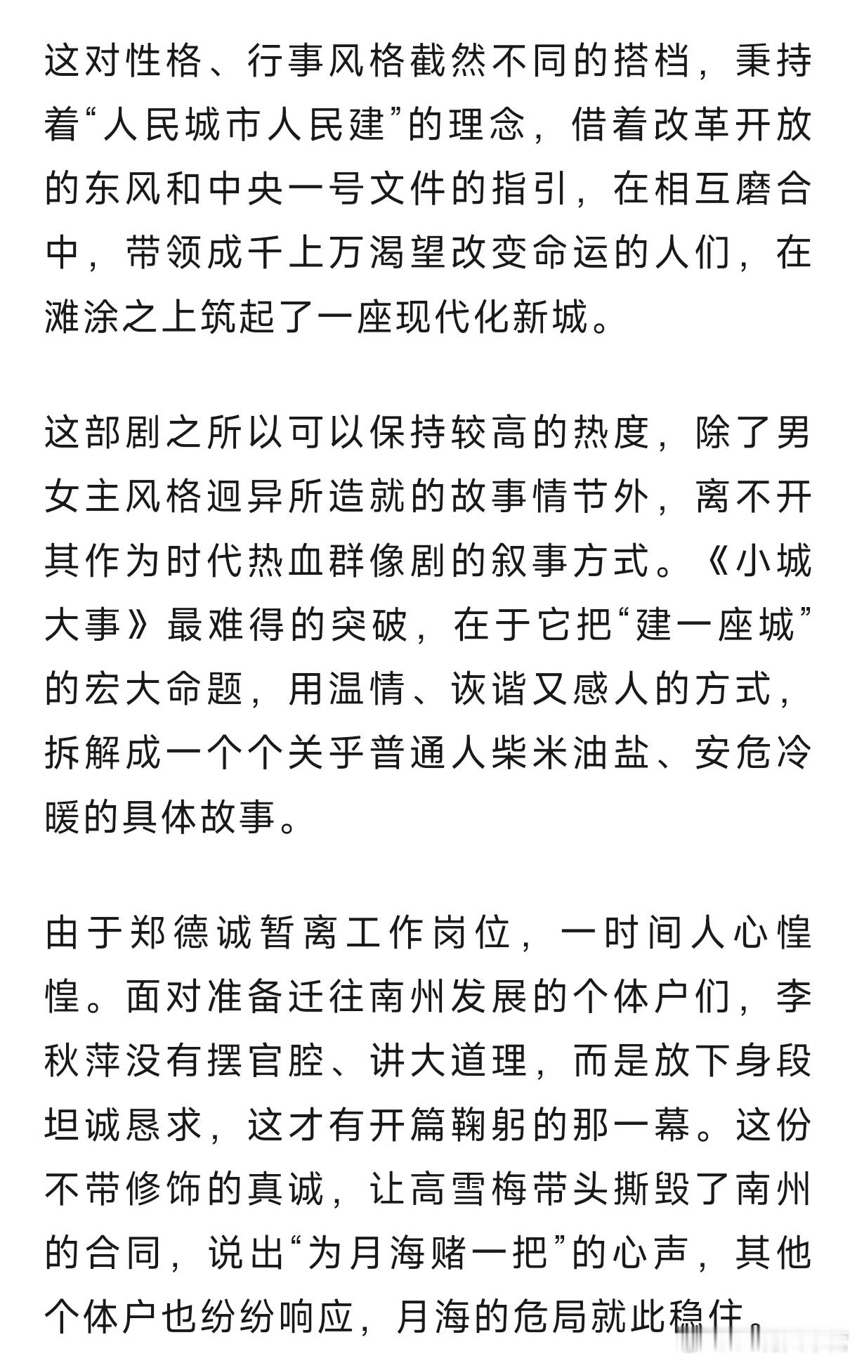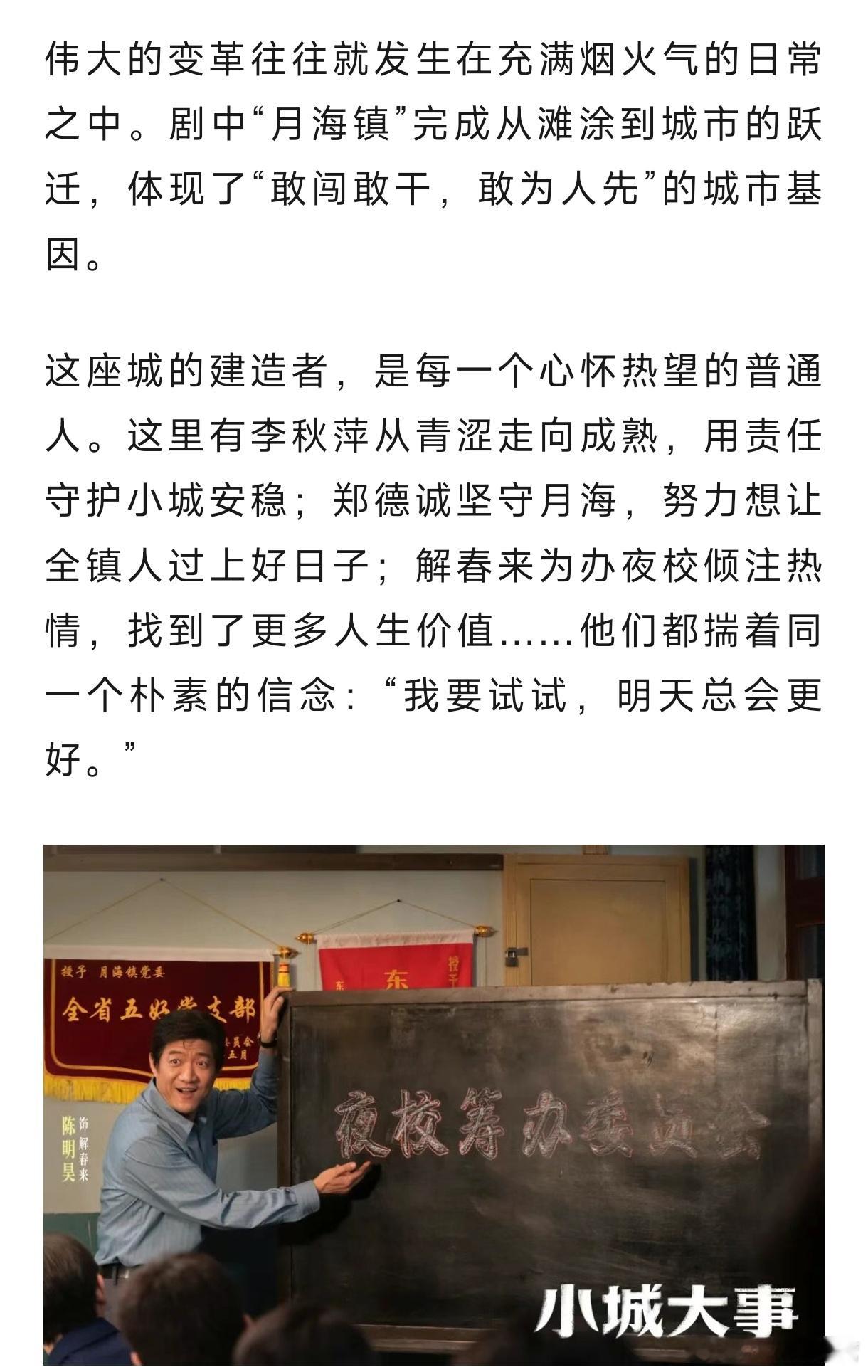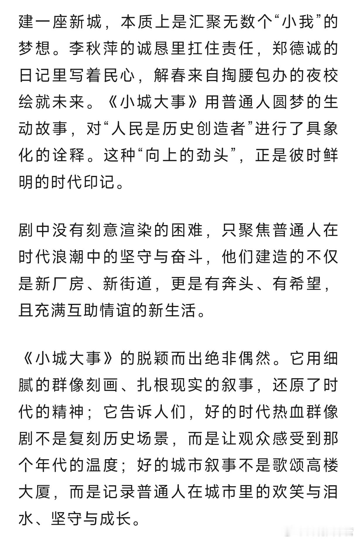 中国新闻周刊——《小城大事》:关关难过关关过,月海全员永不放弃!剧中没有刻意渲染的困难,只聚焦普通人在时代浪潮中的坚守与奋斗,他们建造的不仅是新厂房、新街道,更是有奔头、有希望,且充满互助情谊的新生活。《小城大事》的脱颖而出绝非偶然。它用细腻的群像刻画、扎根现实的叙事,还原了时代的精神;它告诉人们,好的时代热血群像剧不是复刻历史场景,而是让观众感受到那个年代的温度;好的城市叙事不是歌颂高楼大厦,而是记录普通人在城市里的欢笑与泪水、坚守与成长。一部扎根小城的剧,装下了最真实的人间。《小城大事》把小城烟火日常拍成了撼动人心的篇章,这份难得的真诚,值得被更多人看见,也值得被反复品味。小城大事赵丽颖李秋萍