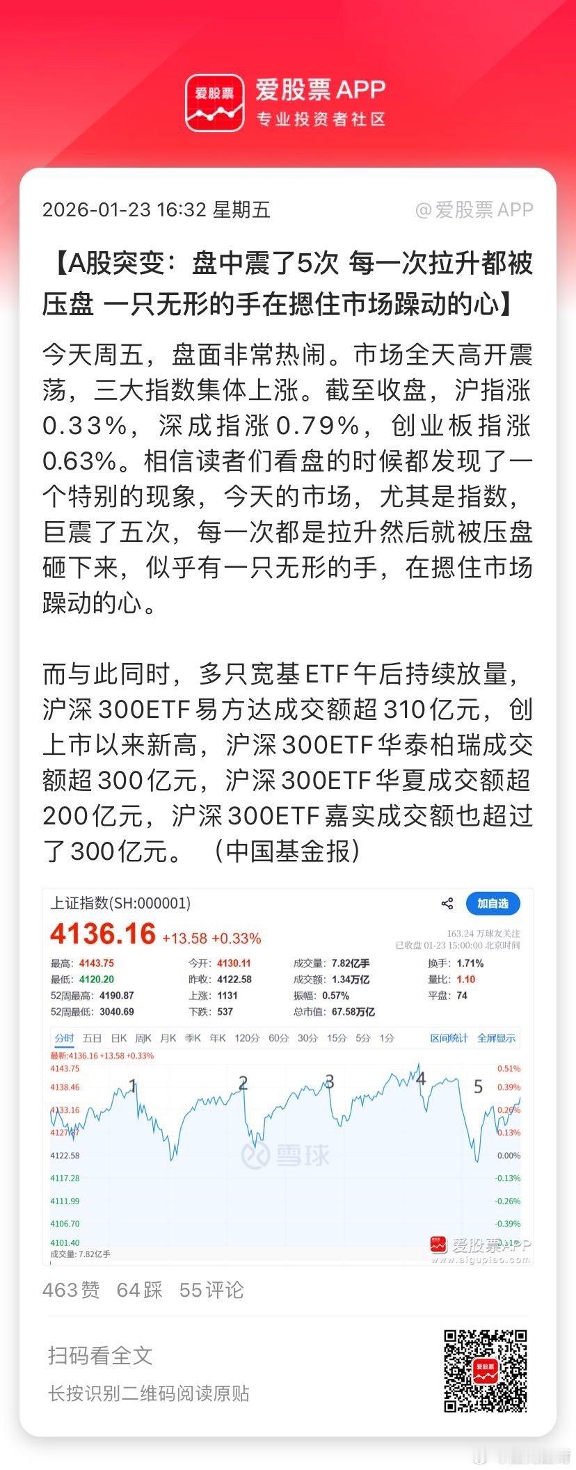 【A股突变:盘中震了5次 每一次拉升都被压盘 一只无形的手在摁住市场躁动的心】今天周五,盘面非常热闹。市场全天高开震荡,三大指数集体上涨。截至收盘,沪指涨0.33%,深成指涨0.79%,创业板指涨0.63%。相信读者们看盘的时候都发现了一个特别的现象,今天的市场,尤其是指数,巨震了五次,每一次都是拉升然后就被压盘砸下来,似乎有一只无形的手,在摁住市场躁动的心。 而与此同... 网页链接