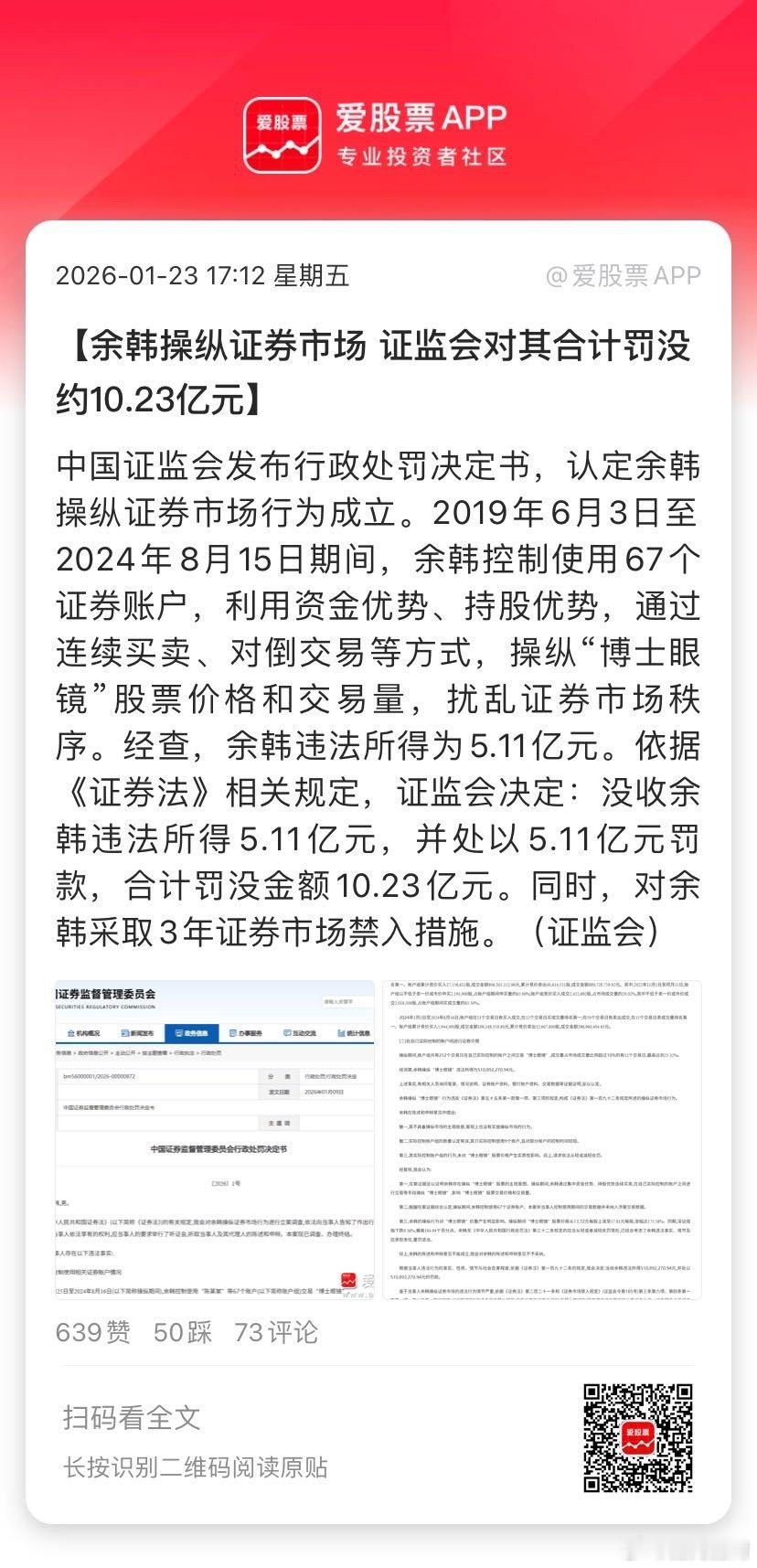 【余韩操纵证券市场 证监会对其合计罚没约10.23亿元】中国证监会发布行政处罚决定书,认定余韩操纵证券市场行为成立。2019年6月3日至2024年8月15日期间,余韩控制使用67个证券账户,利用资金优势、持股优势,通过连续买卖、对倒交易等方式,操纵“博士眼镜”股票价格和交易量,扰乱证券市场秩序。经查,余韩违法所得为5.11亿元。依据《证券法》相关规定,证... 网页链接