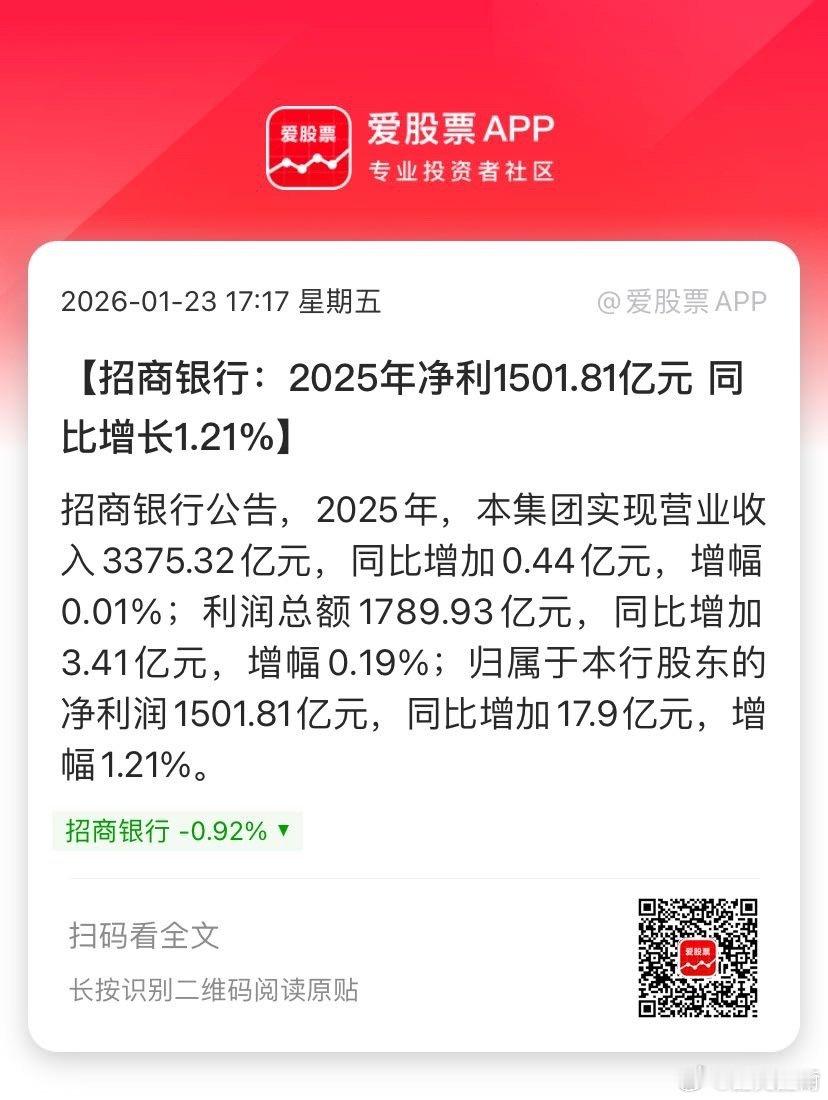 【招商银行:2025年净利1501.81亿元 同比增长1.21%】招商银行公告,2025年,本集团实现营业收入3375.32亿元,同比增加0.44亿元,增幅0.01%;利润总额1789.93亿元,同比增加3.41亿元,增幅0.19%;归属于本行股东的净利润1501.81亿元,同比增加17.9亿元,增幅1.21%。... 网页链接