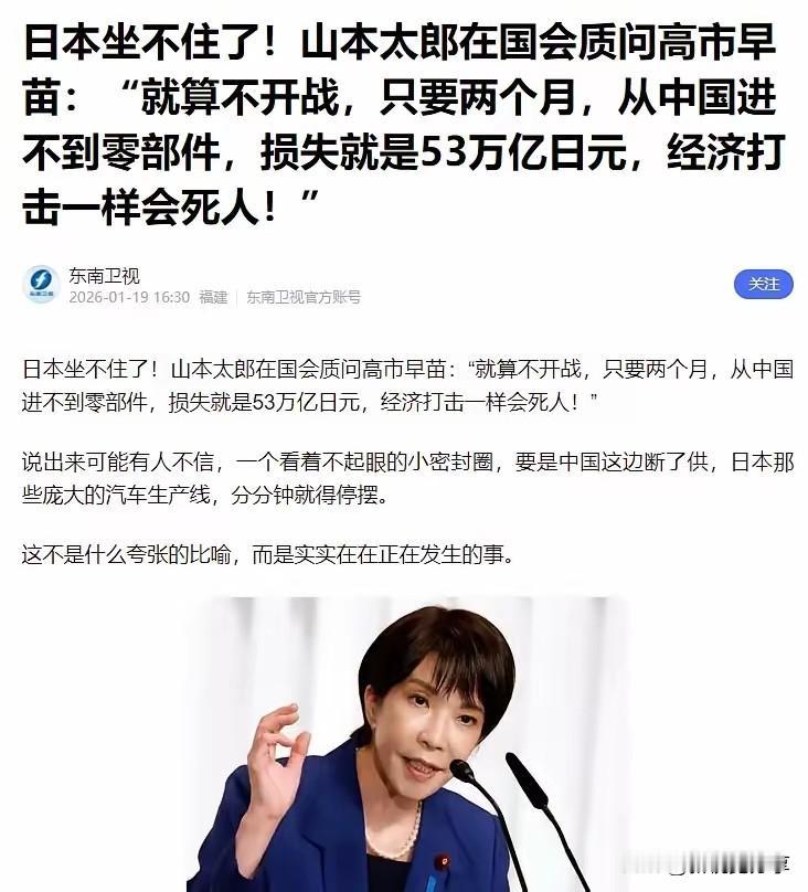 日本彻底坐不住了!山本太郎在国会一针见血!他直言:“中国的军队从未侵略过日本,反而是我们曾经多次侵略过中国,在中国的土地上烧杀抢掠。”与此同时,他警告高市早苗:“就算不开战,只要两个月,从中国进不到零部件,损失就是53万亿日元,经济打击一样会死人!” 可能很多人对山本太郎不太熟悉,这位日本参议院议员可不是普通政客。他原本是演员出身,后来投身政治,多年来一直坚持反战立场,敢在国会说别人不敢说的实话。这次他的发言在日本政坛掀起轩然大波,不是因为言辞激烈,而是戳中了两个最实在的问题:历史真相和现实利益。 咱们先说说历史这事儿。稍微有点年纪的人都知道,近代以来日本对中国的侵略是铁打的事实。从甲午战争到抗战胜利,几十年时间里,日本军队在中国土地上造成的苦难,老一辈人都能说出一堆亲身经历。山本太郎在国会当众承认这一点,在日本政坛实属难得——要知道,不少日本政客要么回避历史,要么歪曲事实,而他敢正视这段历史,本质上是明白:只有认清过去,才能处理好当下的关系。 再看经济上的现实问题,这可不是危言耸听。日本经济产业省有数据显示,日本制造业的关键零部件,近四成来自中国。小到汽车上的电子传感器,大到半导体生产用的材料,缺了中国供应,生产线当天就得停。去年丰田汽车就因为中国一家供应商的芯片电阻断供,两家工厂停了两周,直接损失120多亿日元。 更关键的是,这种依赖不是短期能替代的。日本造汽车、家电离不开中国的零部件,就连造先进武器需要的稀土、镓这些材料,也大多从中国进口。有机构测算,53万亿日元相当于日本半年的GDP总量,要是真断供两个月,两千多家中小企业得倒闭,上百万日本人可能失业。这可不是数字游戏,而是关系到普通日本人饭碗的大事。 山本太郎的警告,其实点出了日本当前的尴尬处境:一方面跟着别人搞对抗,另一方面经济上又离不开中国。现在全球供应链早就连在一起了,日本企业为了降低成本、提高效率,把很多关键环节放在中国,这是市场选择的结果。现在想搞“脱钩”,无异于自己断自己的路。 历史和现实都摆在这儿,中日之间的关系从来不是简单的对抗能说清的。正视历史、尊重现实,才是对两国人民都负责的态度。各位读者你们怎么看?欢迎在评论区讨论。