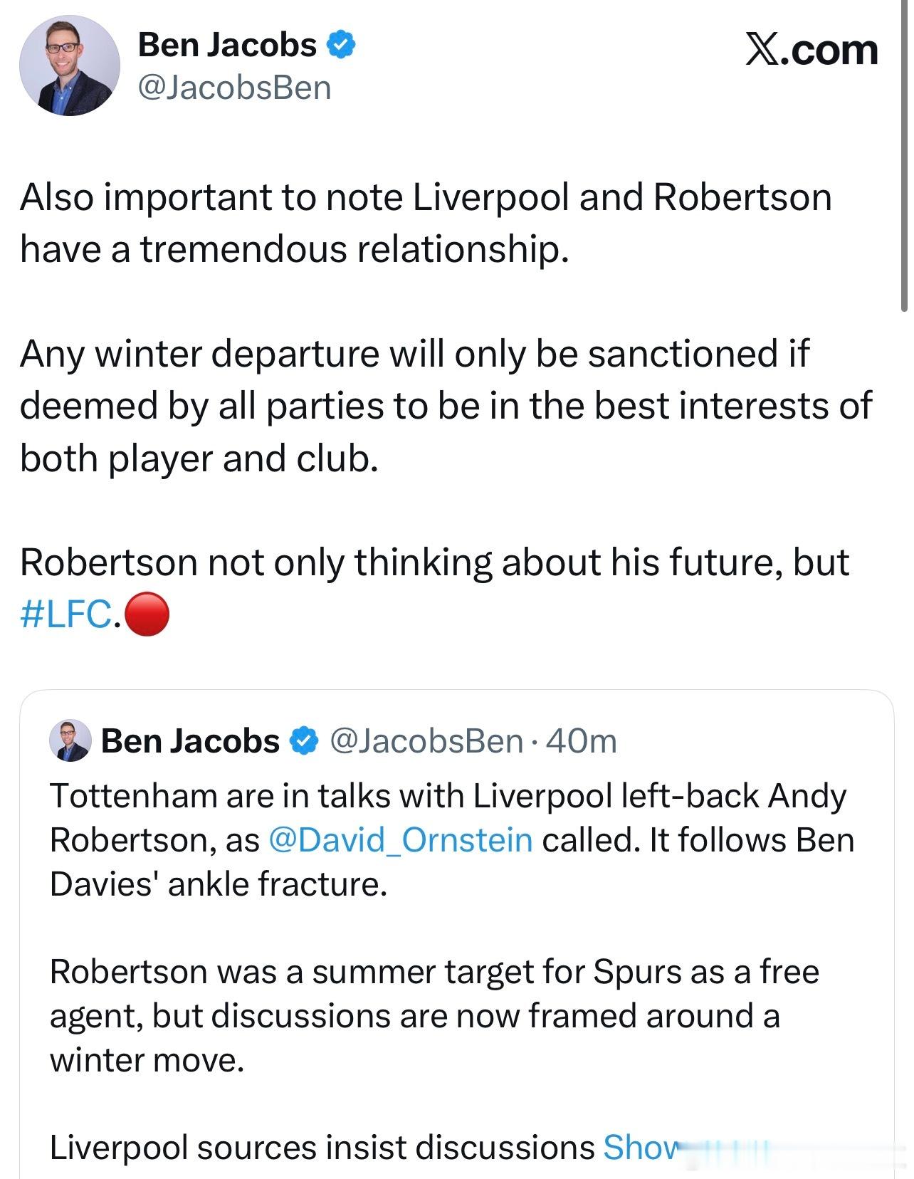 奥恩斯坦独家,热刺想要夏窗免签萝卜。热刺方面提前制定了计划,目前各方的谈判都在推进当中。 这意思还是之前想法是夏窗免签,但是本戴维斯受伤之后现在已经在谈冬窗就引进萝卜的事了。所以萝卜也是有可能冬窗就直接转会的。 Ben Jacobs的意思是目前的沟通还在初期,萝卜和我军之间良好的关系以及萝卜长久以来对利物浦的贡献也是我军允许他们现在先进行接触的原因。这边转会也只有在双方认为对球员和俱乐部都有利的情况下才会被批准,萝卜不仅仅只是考虑自己的未来,同样也还有利物浦的。